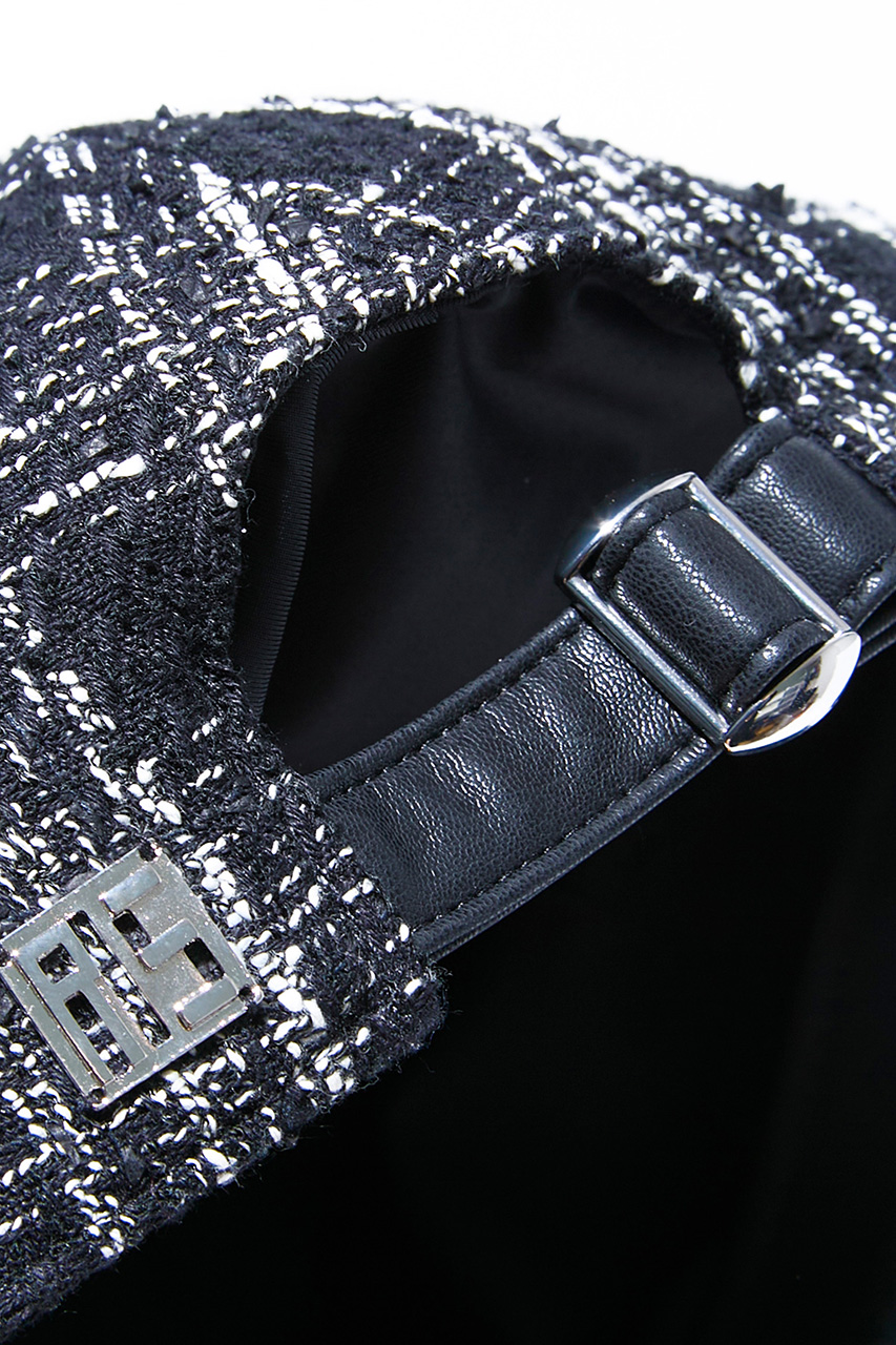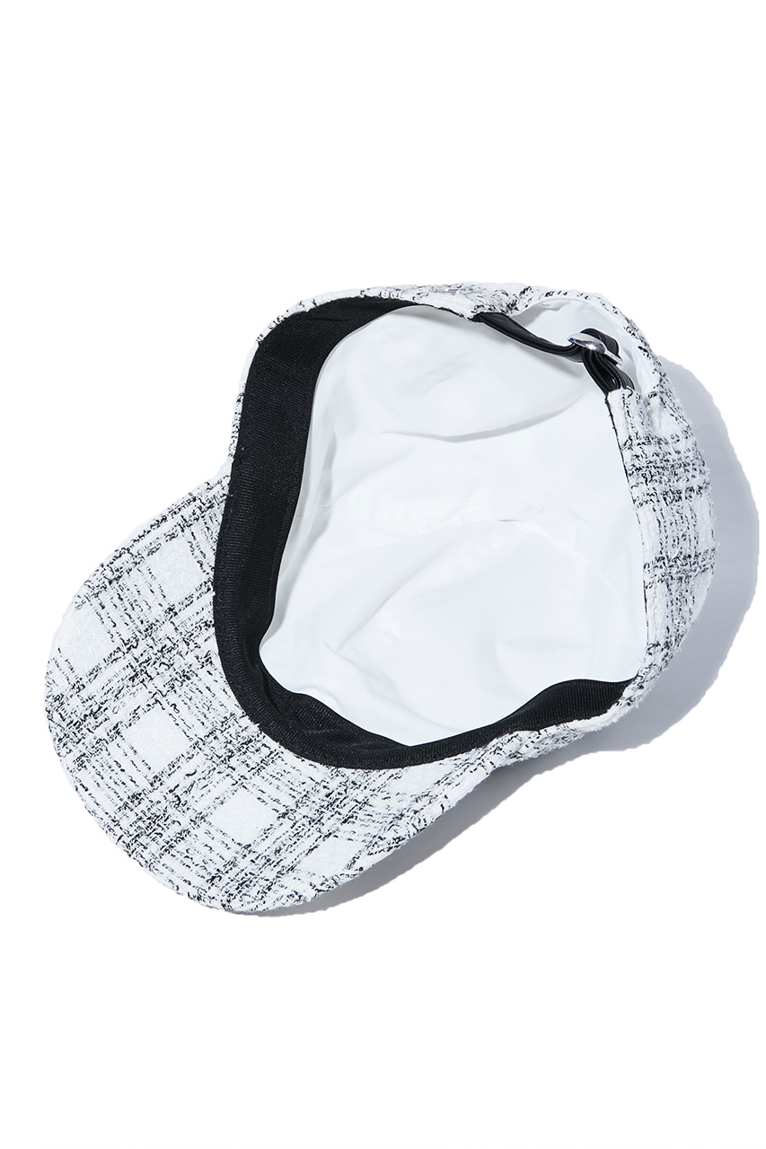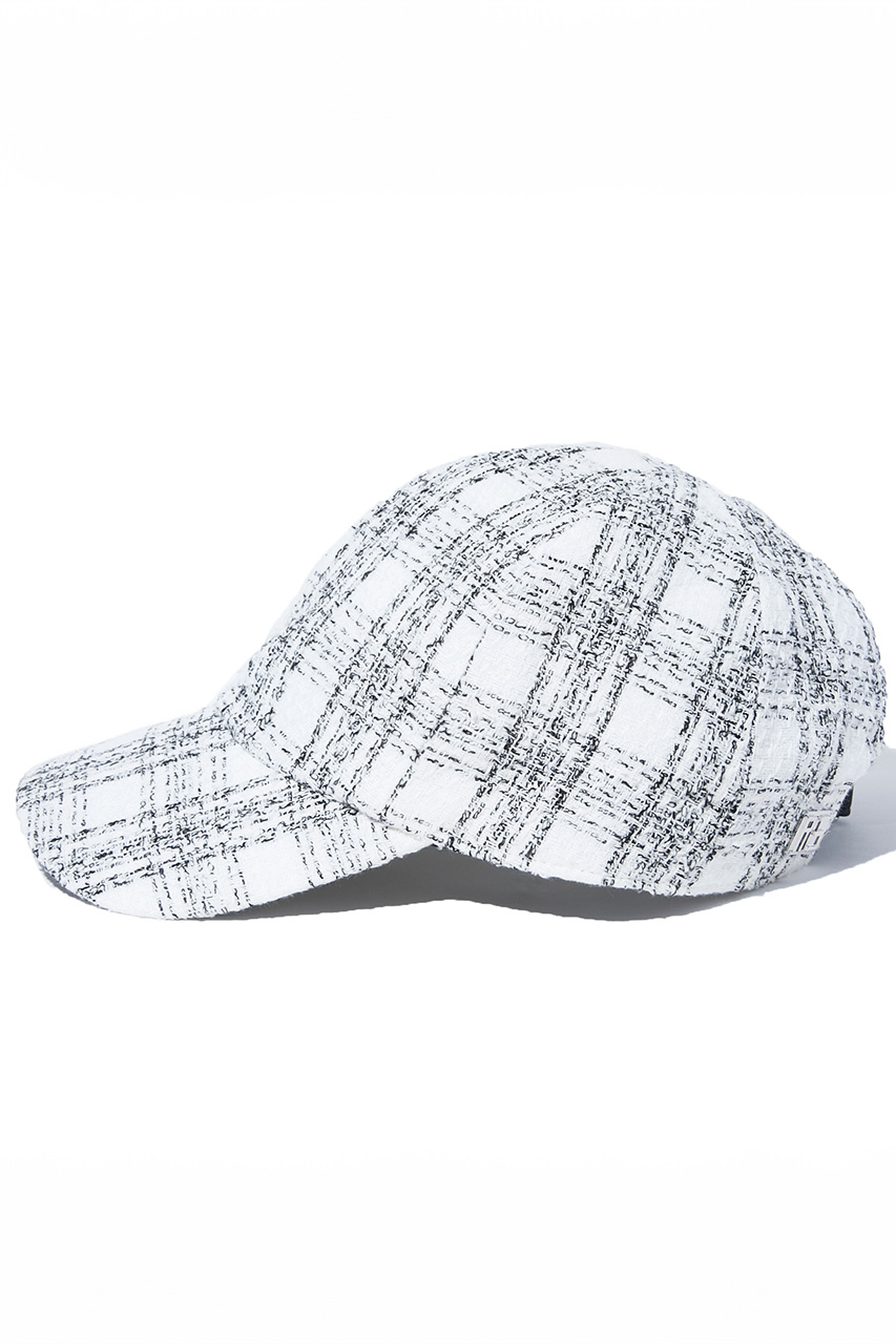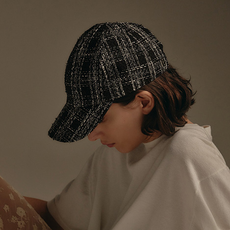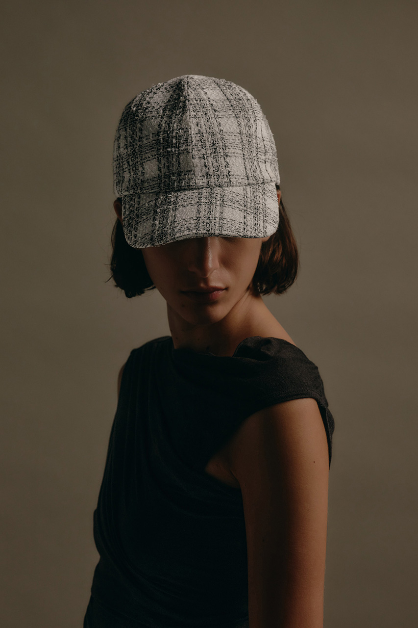 異素材が交差する格子柄をモダンに昇華したキャップ。ブラックとホワイトの2色展開。ツイードライクな表情と接触冷感機能で、シーズンレスに快適な被り心地。