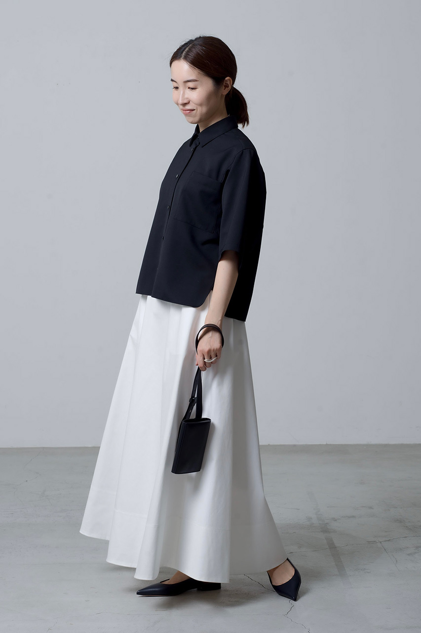 立体的なフォルムが際立つボックスシルエットのシャツは、ホワイトのフレアスカートにバサッと合わせて少しモードに着こなすのがお気に入り。ジメジメした季節にはブラック×ホワイトでスタイリングに清潔感を漂わせて。