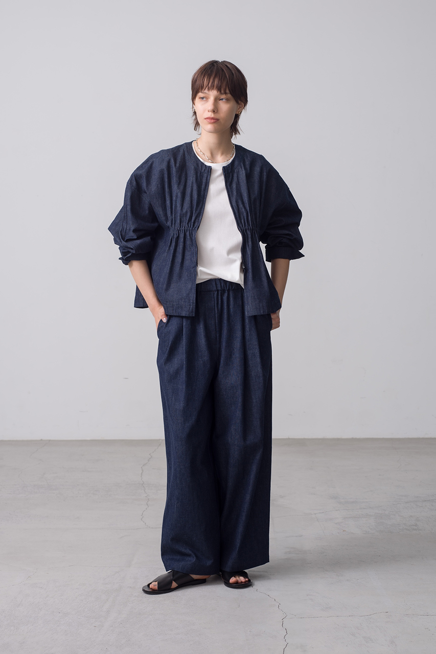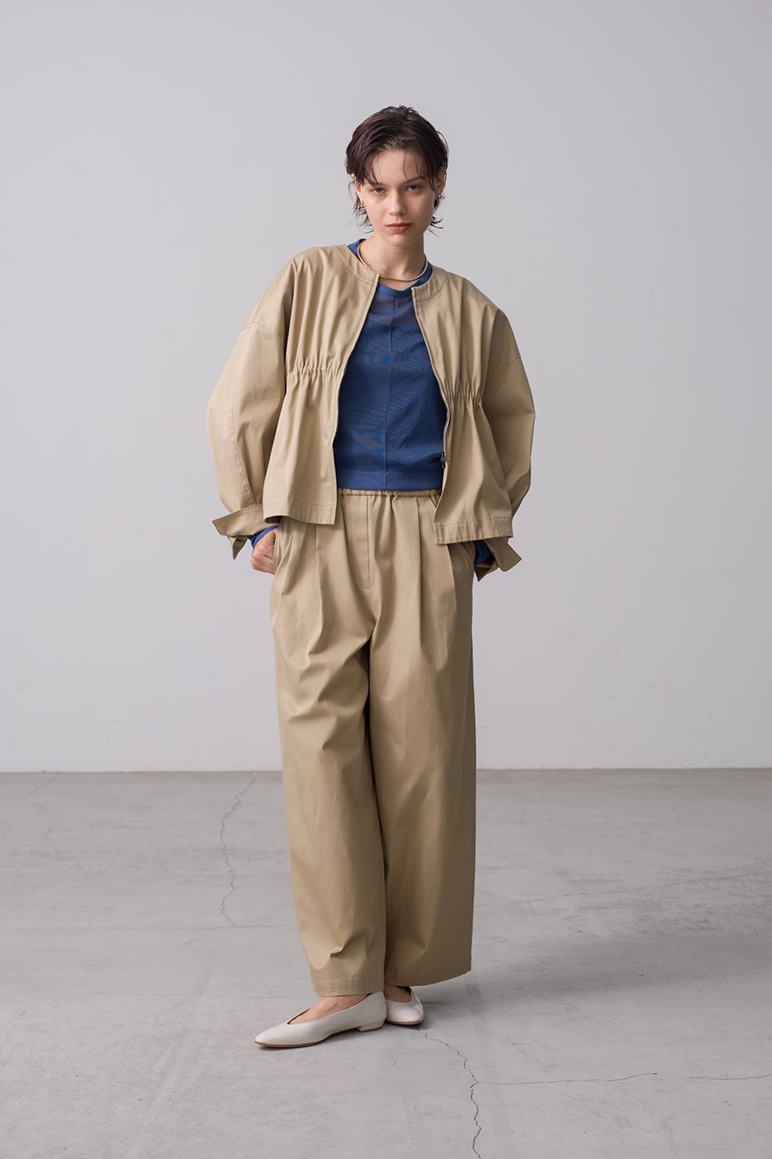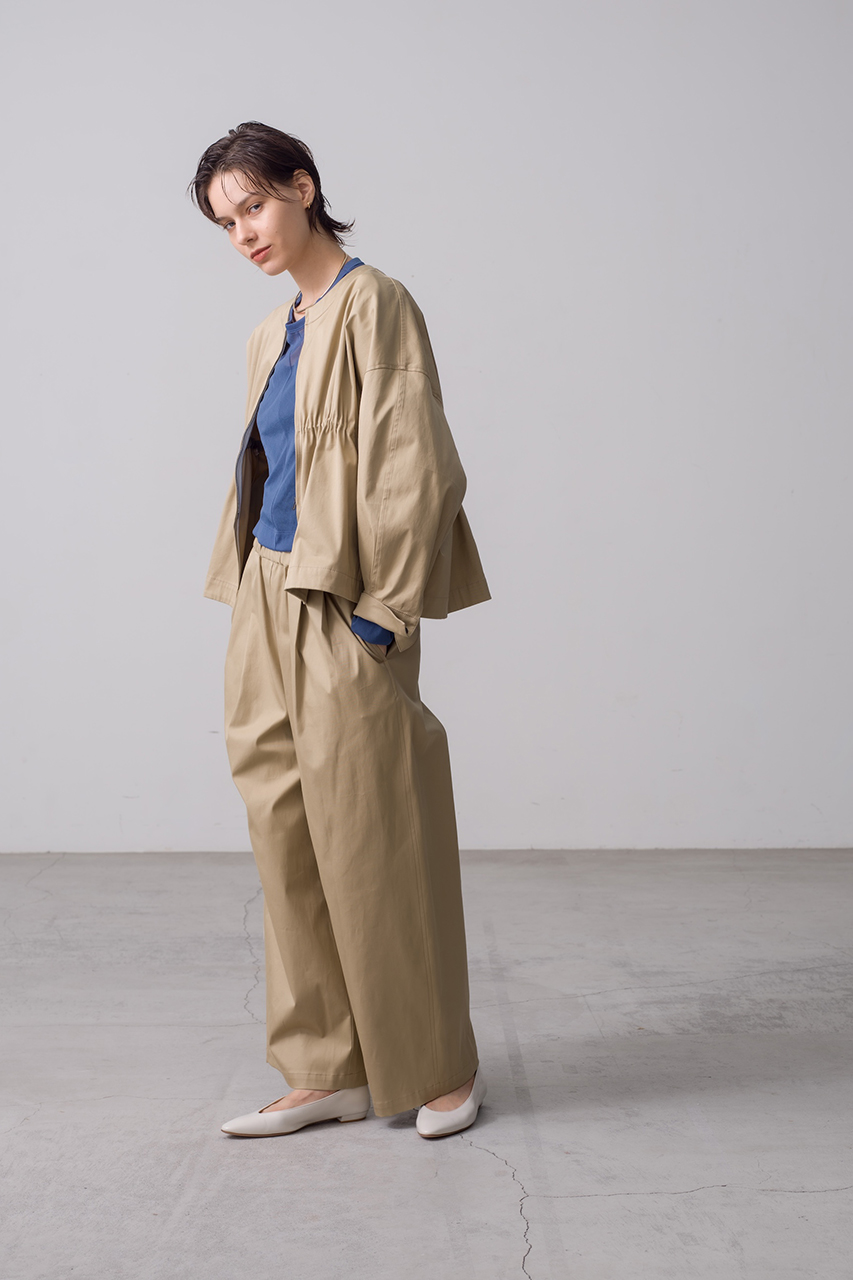 エル・ショップと「エブール」二子玉川店でしか手に入らない限定ジャケットも早めに押さえて。いまからすぐに着まわせる軽やかなショート丈のギャザージャケットは、デニムとチノの2素材でご用意。内側のギャザーで絞り具合を調整してフォルムアレンジができるのはもちろん、フロントの逆開ファスナーで上下の開き具合も変えられる変幻自在なデザインが◎。それぞれセットアップ可能なパンツもラインナップしています。