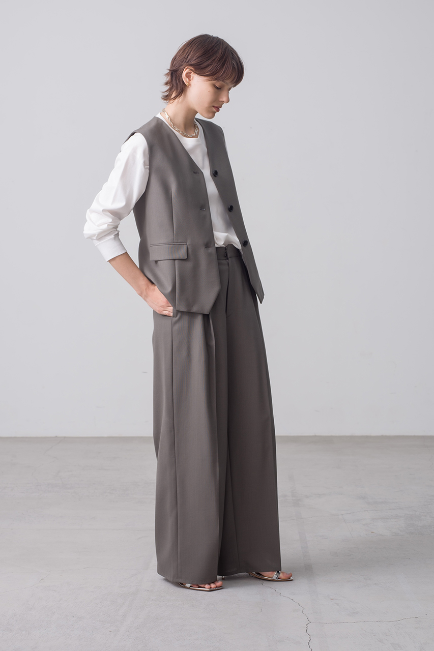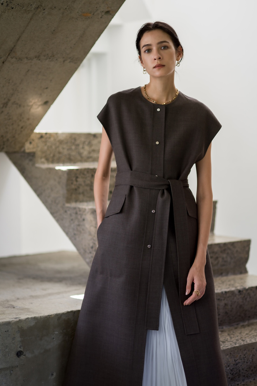 リーンなシルエットを叶えたいなら、この秋はカラーレスのロングジレが正解。トレンドに左右されないベーシックなデザインに、適度なハリとドライタッチな素材感がマッチ。センターバックに大きなボックスタックを施してボリュームを出しつつ、バックベルトで横広がりしないように仕上げました。よりカジュアルに羽織れるショートジレも要チェック!