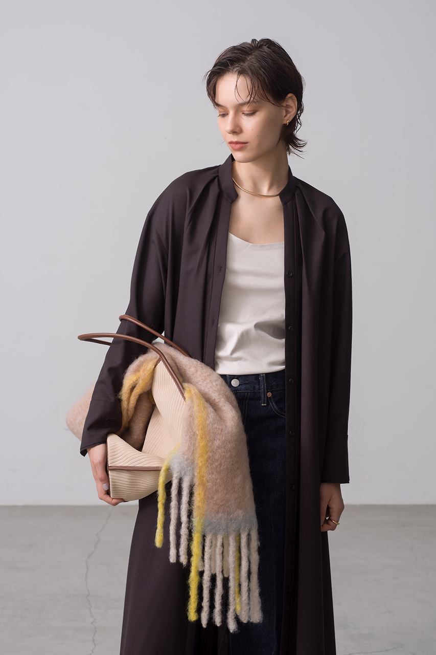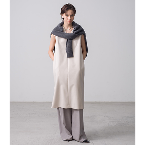 しっとりとしたソフトな風合いが上品なワンピースは、暑さの残る秋からさらりと1枚で着用できる注目アイテム! 着用すると自然とバックに分量が溜まって、さりげなくこなれ感が漂うシルエットにこだわりました。10月はざっくりしたニットを軽く肩に巻いて、少し肌寒くなってきたらパンツやシャツとのレイヤードを楽しみながらロングシーズン活躍します。