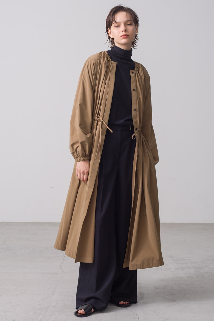 大人スポーティーな要素を取り入れたカジュアルなワンピースコートは、ウエストのドローコードでボリューム調整が可能。前開きのフロントを閉じてワンピースとして着用したり、ボタンを全て開けてコート風に着用したりと着まわし幅の広い一枚です。程よくボリュームを持たせた袖口ゴムは、ラフにたくし上げるのが抜け感をだすコツ。