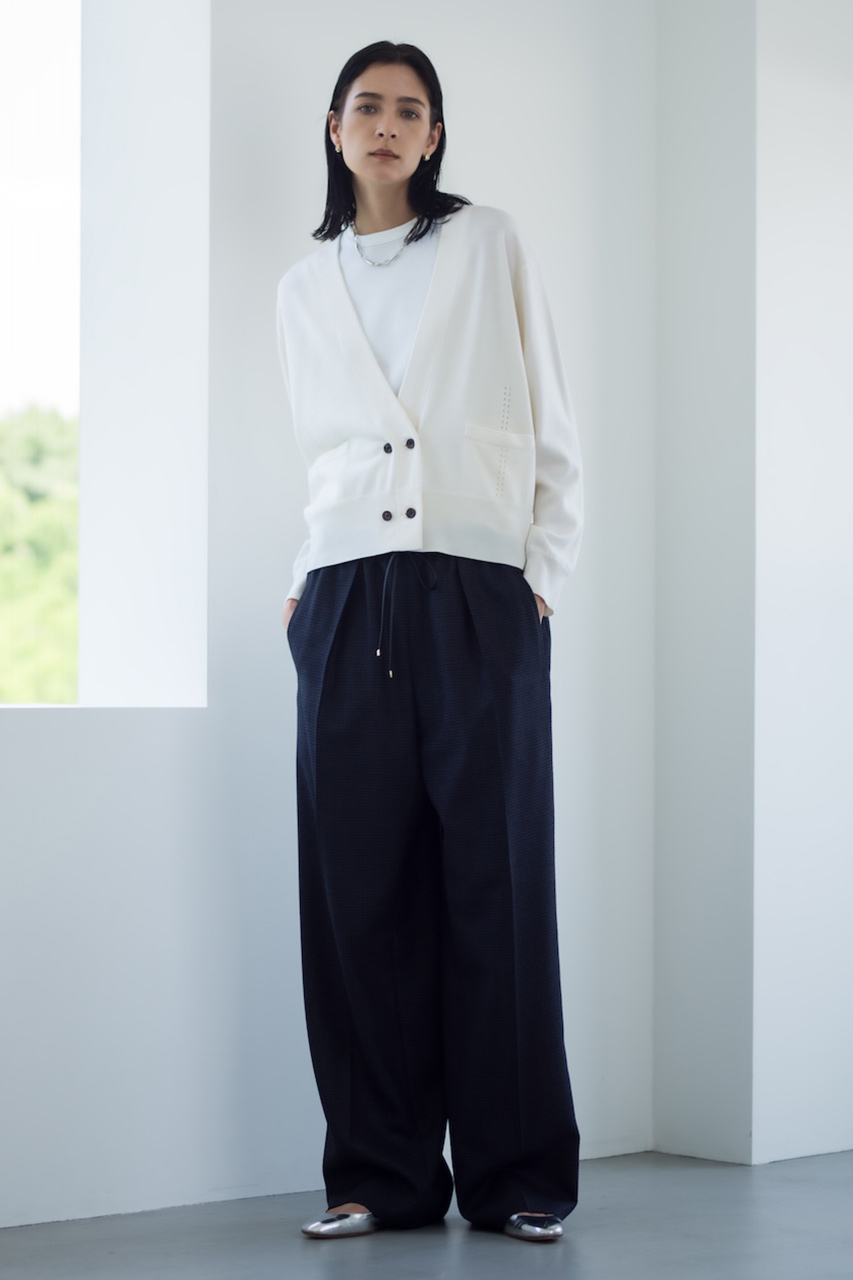洗練されているのに今っぽい、を叶えるならこちら。素材のよさがひと目で分かってしまうベーシックニットだからこそ、きちんとこだわったものを選びたいもの。カシミヤとシルクの上品でナチュラルな光沢が光ります。トップスはお好みで選べるクルーとVネックの2型。カラーレスジャケットのように羽織れるカーディガンも必見です。