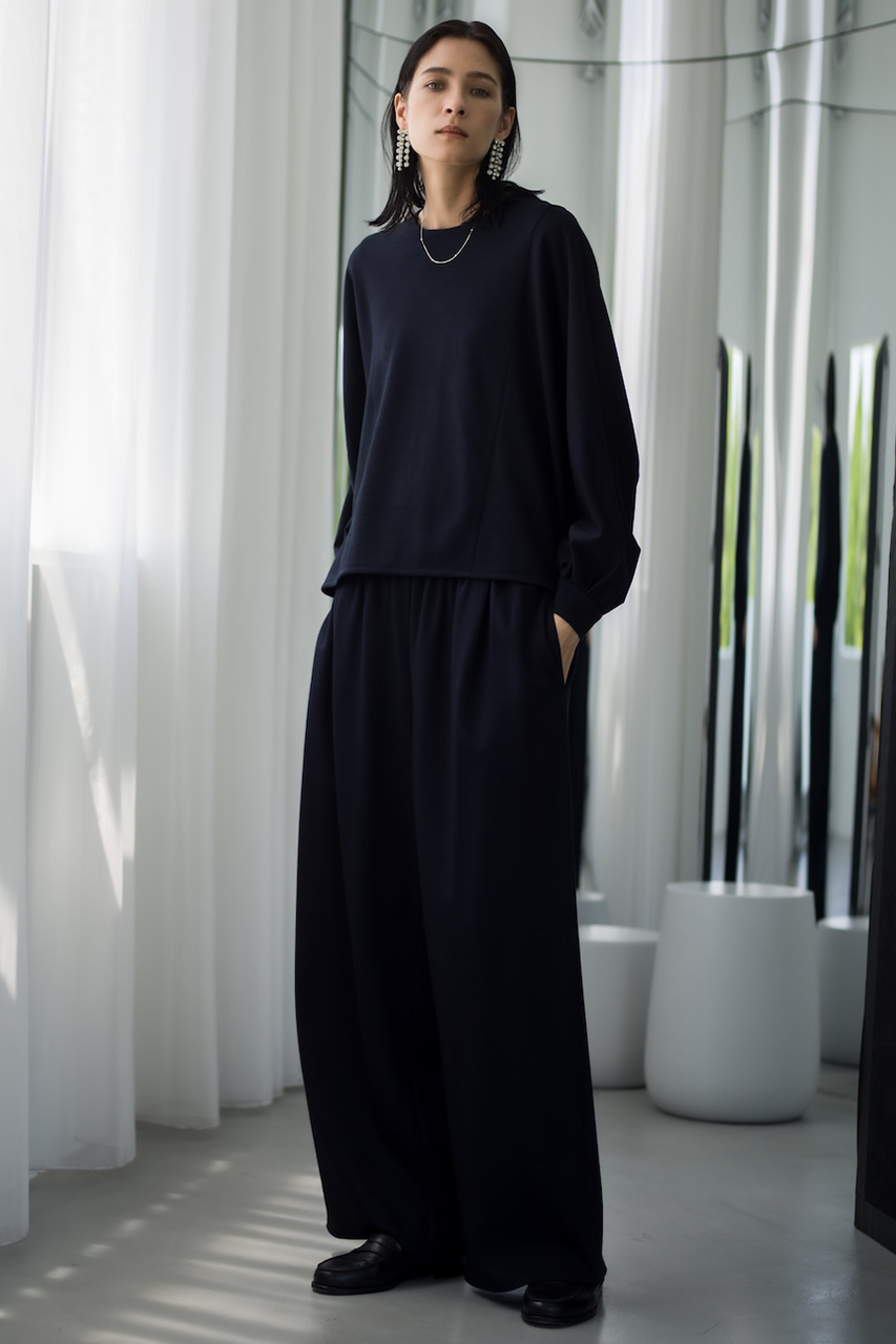 長く愛せるデイリースウェットなら、大人を知り尽くした「エブール」にまかせて。ゆとりのある身幅を裾に向かって少しスッキリとさせることで、実際に着た時にバックが長く、膨らみのニュアンスが出るように仕上げました。カジュアルなスタイリングはもちろん、プリントやジャカードなどのきれいめスカートと合わせても素敵。