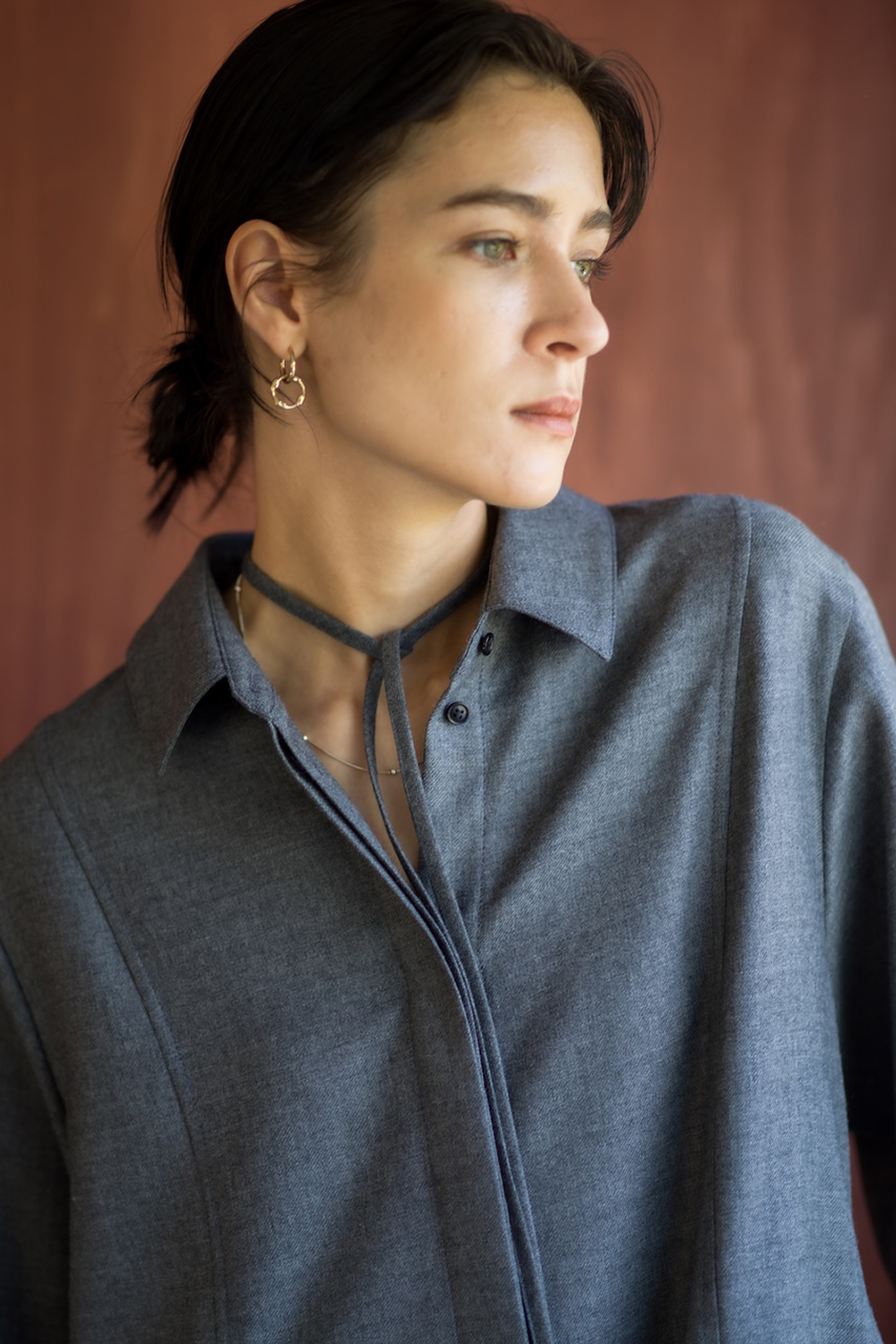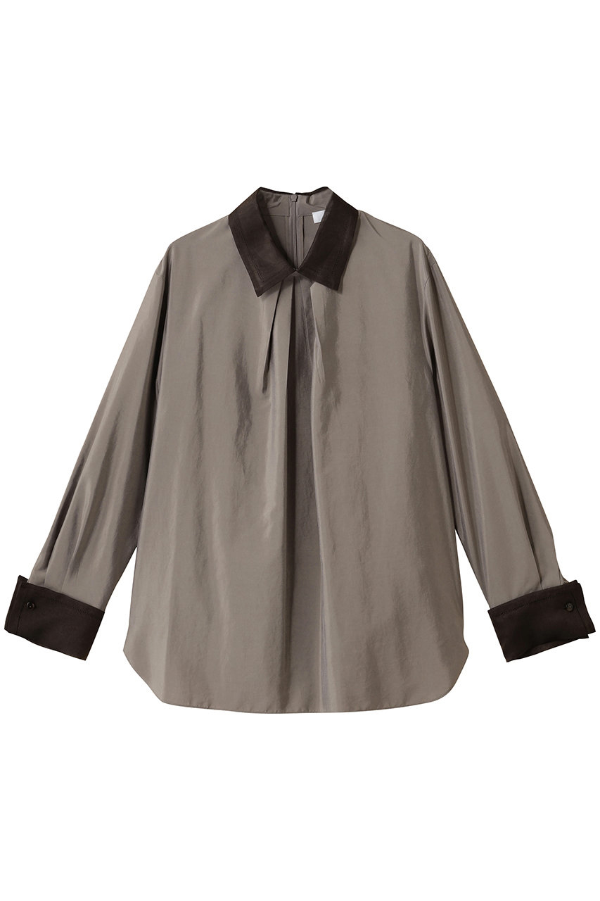 シルクオーガンジーの襟とダブルカフスが華やかなデザインブラウス。光沢のある素材と胸元のタックがフェミニンな印象を漂わせてくれるので、あえてコーデュロイパンツやデニムと合わせて、甘さを抑えるのも今年らしくておすすめ。冬にはニットインして襟元のレイヤードを楽しんでみて。