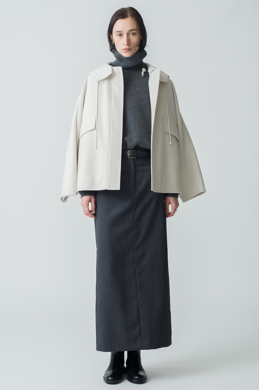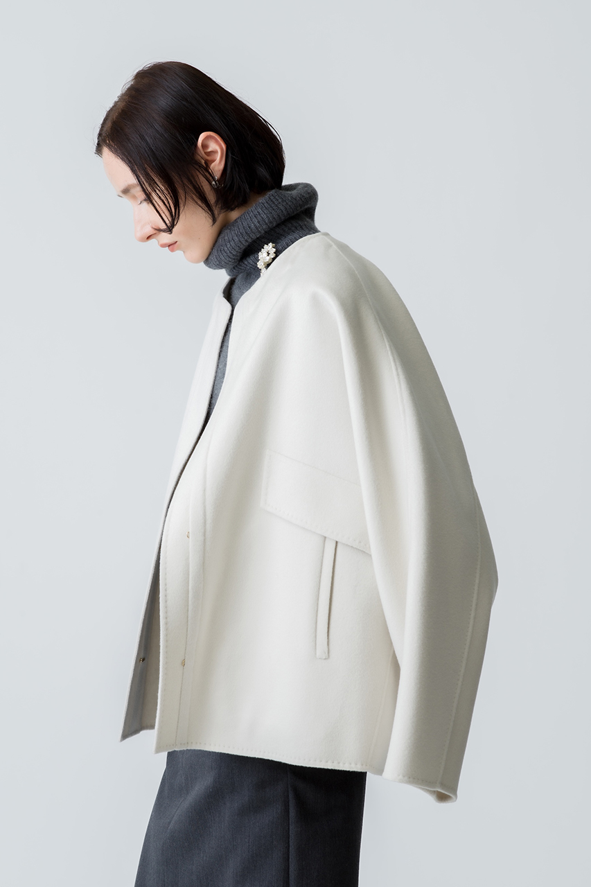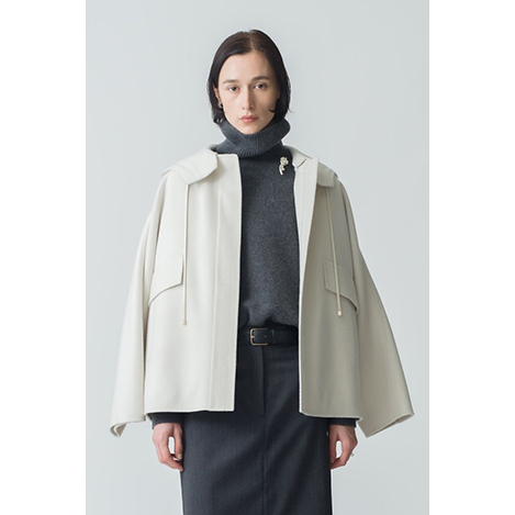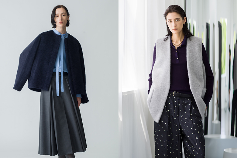 しなやかで美しい毛足が目を引くシャギーコートは、希少価値の高いスーリーアルパカを原料としたイタリア製素材。贅沢な分量感のドルマンスリーブで丸みのあるフォルムを叶えたショートコートは、どんなスタイリングにも合わせやすく、ブルゾンライクに羽織れるラフな着用感が魅力! ニットやアウターとのレイヤードでロングシーズン重宝するV開きのジレもご用意しています。