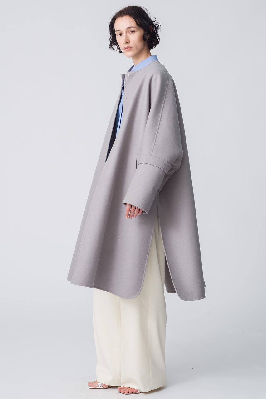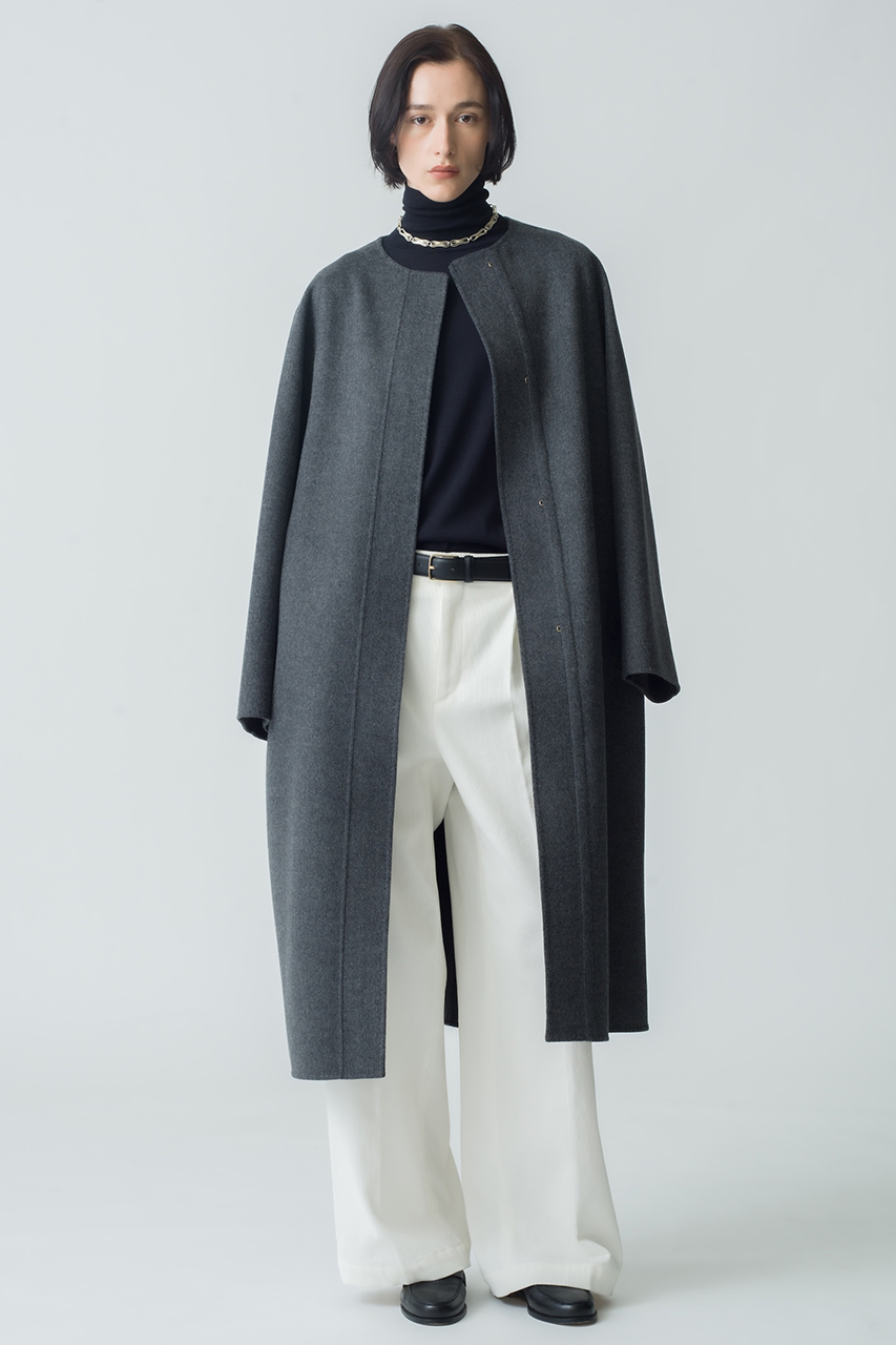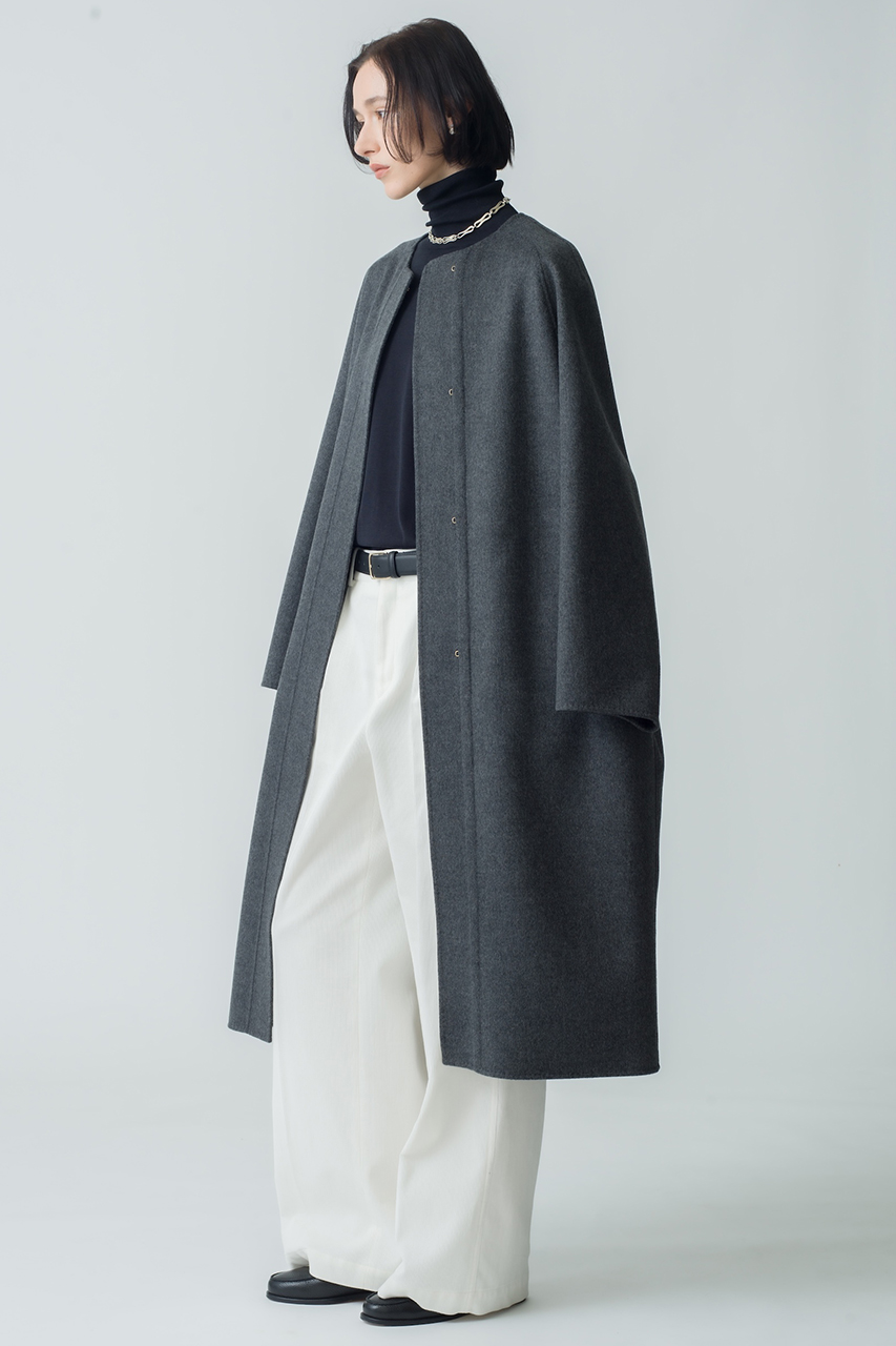 オフィスや学校行事、セレモニーなどシーンレスに着られるコートをお探しなら“リュクスシャルムビーバー”のロング丈が断然おすすめ! ショルダー周りや前後の分量感など、こだわりのパターンによってシンプルな中に計算された美シルエットが完成します。“リュクスシャルムビーバー”よりもやや短めな丈とサイドスリットで、ロングでもバランス良く着れる“リュクスメルトン”にも注目。立体的なフォルムと袖のベルトデザインがよりスタイリッシュなムードを醸します。
