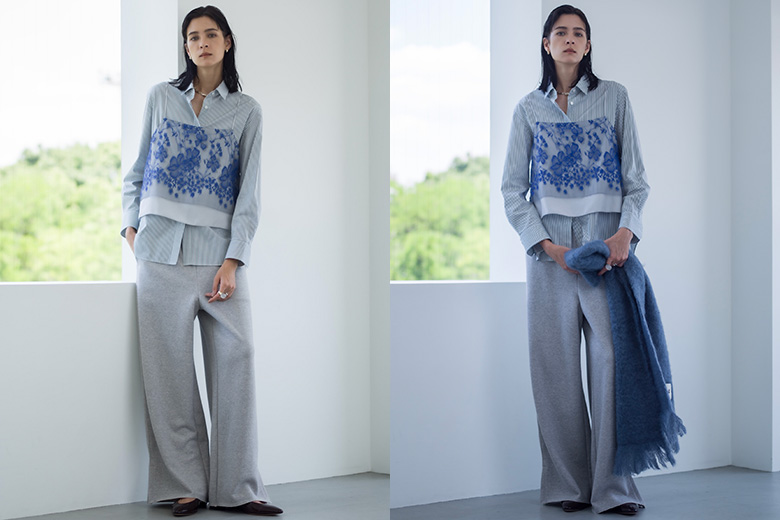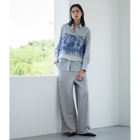 「裁ち切り始末の裾とスリットがこなれた雰囲気を醸してくれる大人のスウェットパンツをオン・オフ愛用中! カジュアル過ぎないクリアな表面感なので、シャツやブラウスに合わせても◎。きれいめカジュアルな気分の日につい手に取る一本です」。(スタッフT)