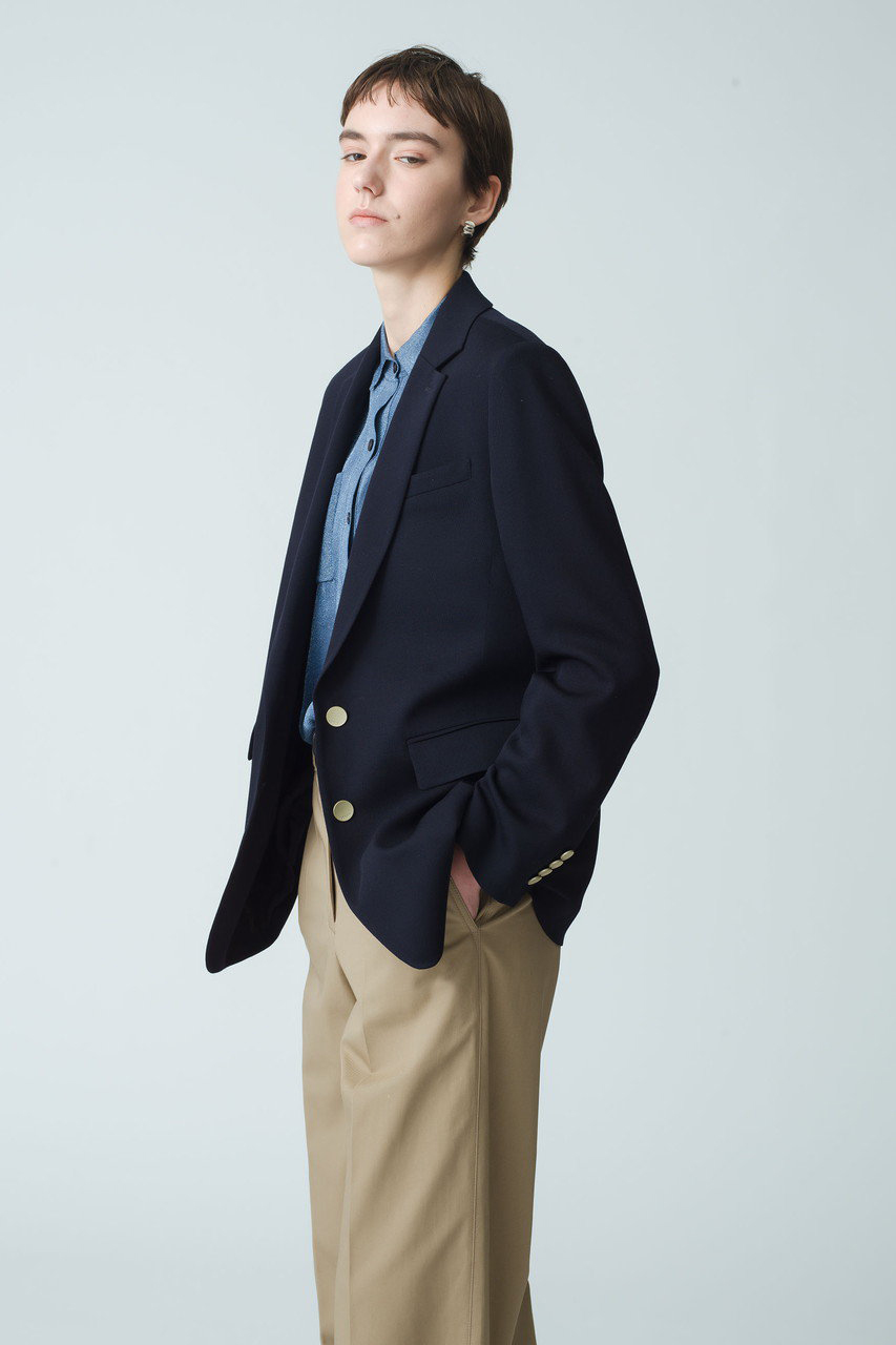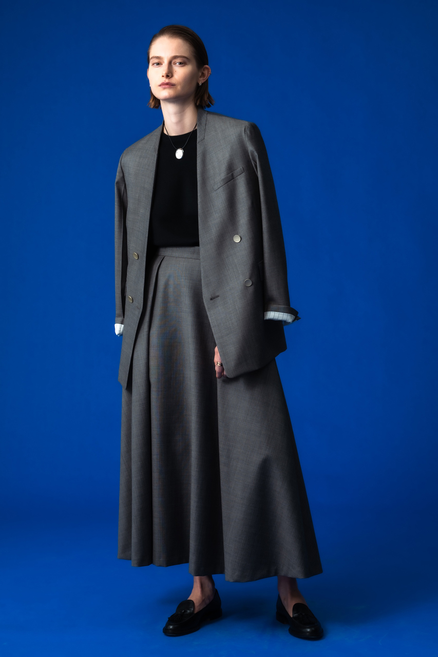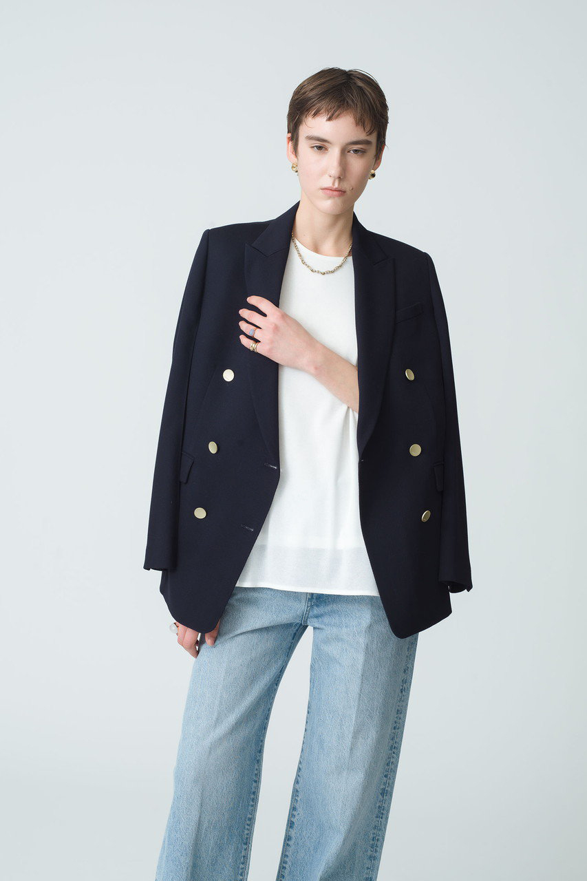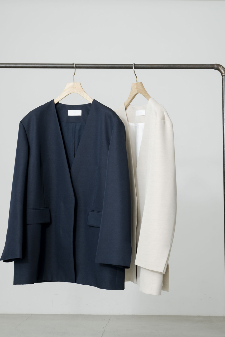 春に向けて抑えておきたい、ダブルブレストのノーカラージャケット。ボクシーなフロントシルエットと、パネルラインによってさりげなく女性らしさを感じるバックシルエットのバランスが絶妙。ボトムス次第でシーンレスに重宝する一枚です。