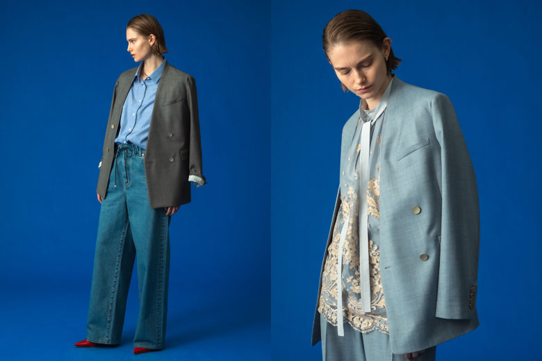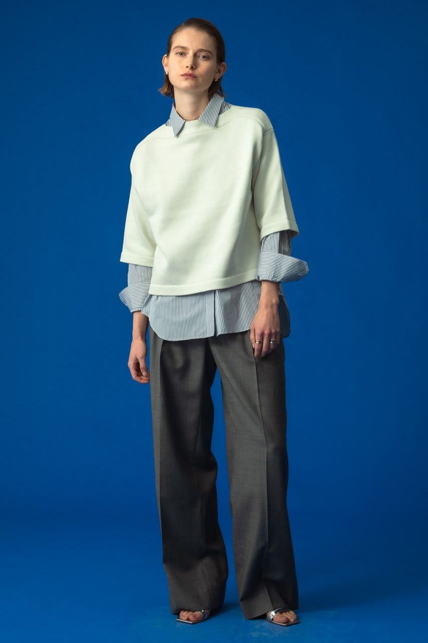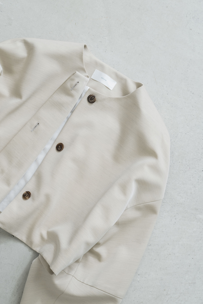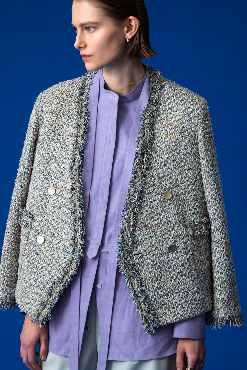 春に向けて抑えておきたい、ダブルブレストのノーカラージャケット。ボクシーなフロントシルエットと、パネルラインによってさりげなく女性らしさを感じるバックシルエットのバランスが絶妙。ボトムス次第でシーンレスに重宝する一枚です。