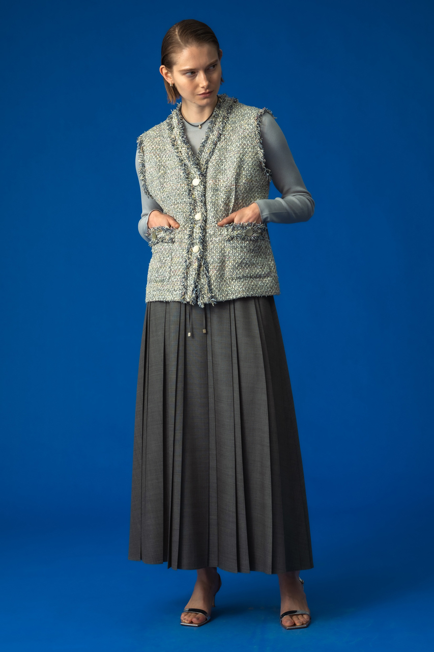ジャケットとセットアップ可能なボトムはスカートとパンツをご用意。ウエストゴムのイージースカートは、オリジナリティあるランダムプリーツが新鮮。上品さを漂わせる白金のスピンドルもアクセントに。マーベルト仕様のシンプルな2タックパンツは、太過ぎないストレートラインがオン・オフ問わず活躍するはず。