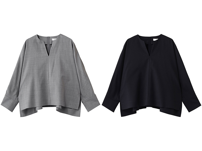 セパレートで着られるブラウスもラインナップ。着まわし度の高いシンプルアイテムながら、抜け感のある続き袖とタックを寄せた後ろのボリュームスリーブがアクセントを添えてくれます。キーネックとサイドスリットですっきりとした着こなしに。
