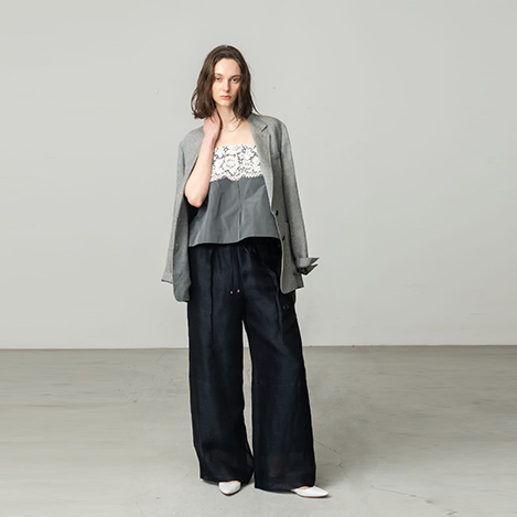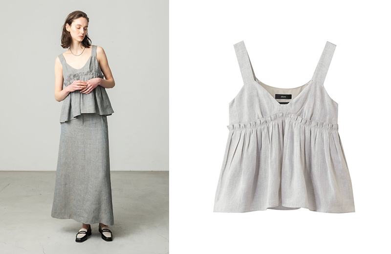 今年の空気感を纏えるショート丈のキャミソール×マキシスカート。リネンならではの軽やかな揺れ感が美しいセットアップです。バスト下にタック&ギャザーをふんだんにあしらった甘さのあるキャミソールなので、マニッシュなボトムスやデニム×ヒール合わせで甘辛バランスを取るのもグッド。ショルダーストラップは調整可能です。
