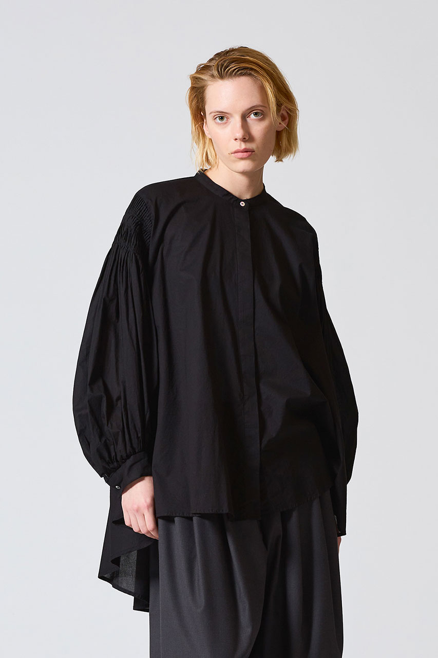 薄くて軽い60ローン糸を使用したギャザースタンドカラーシャツ。