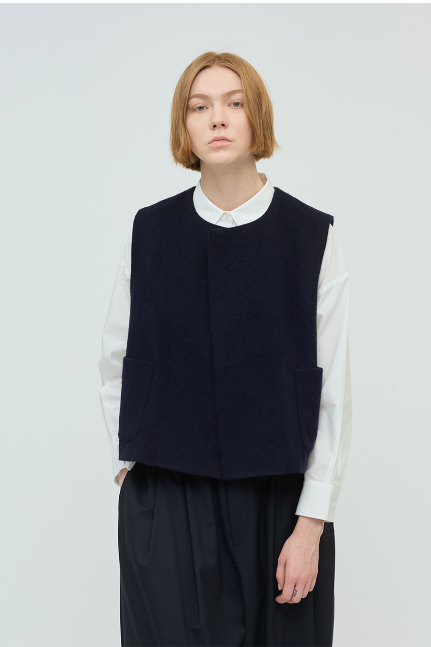 コートライクなベストを表現したポケット付クルーネックベスト。