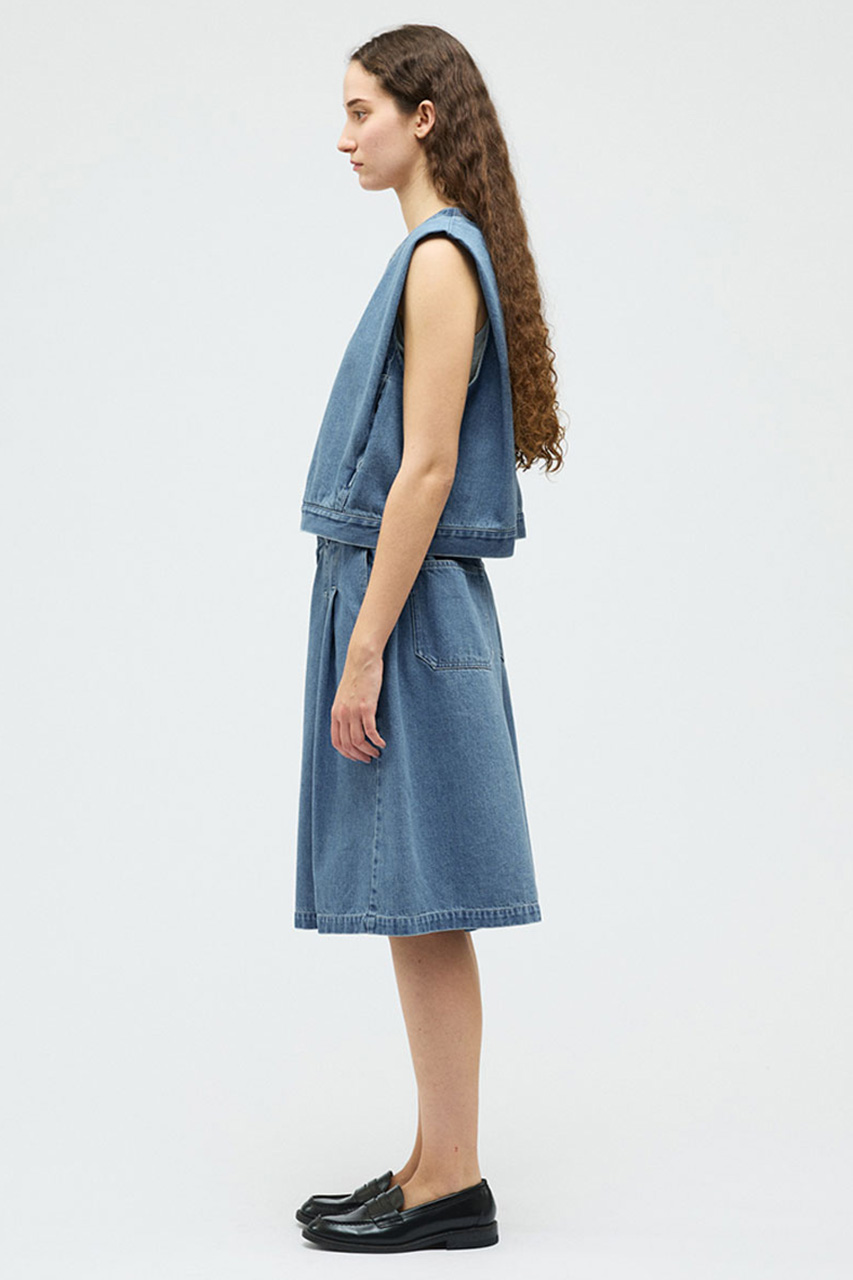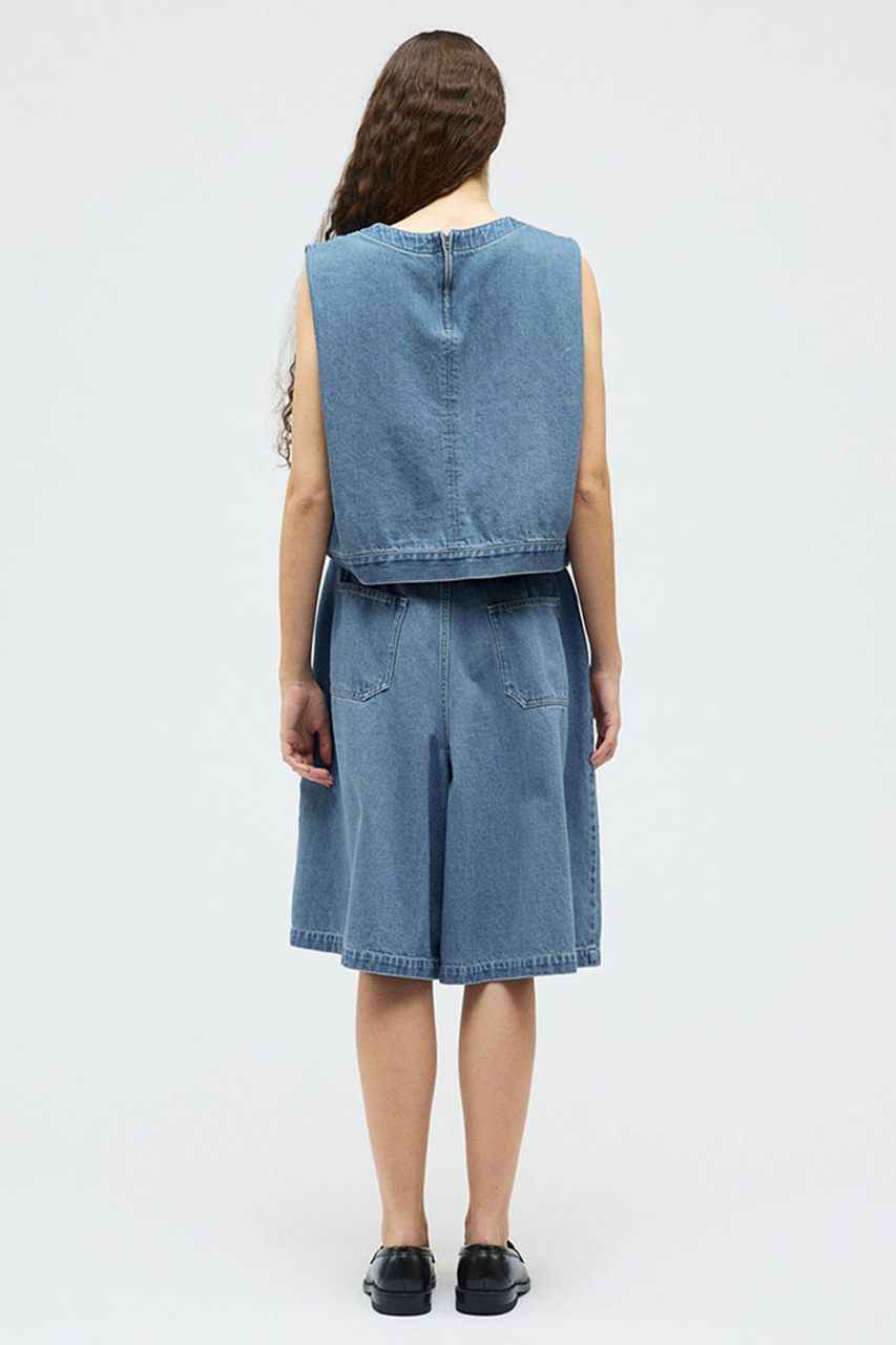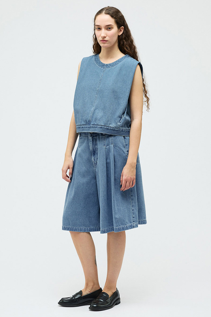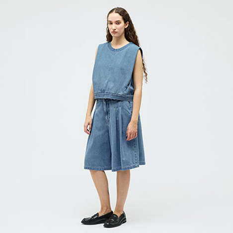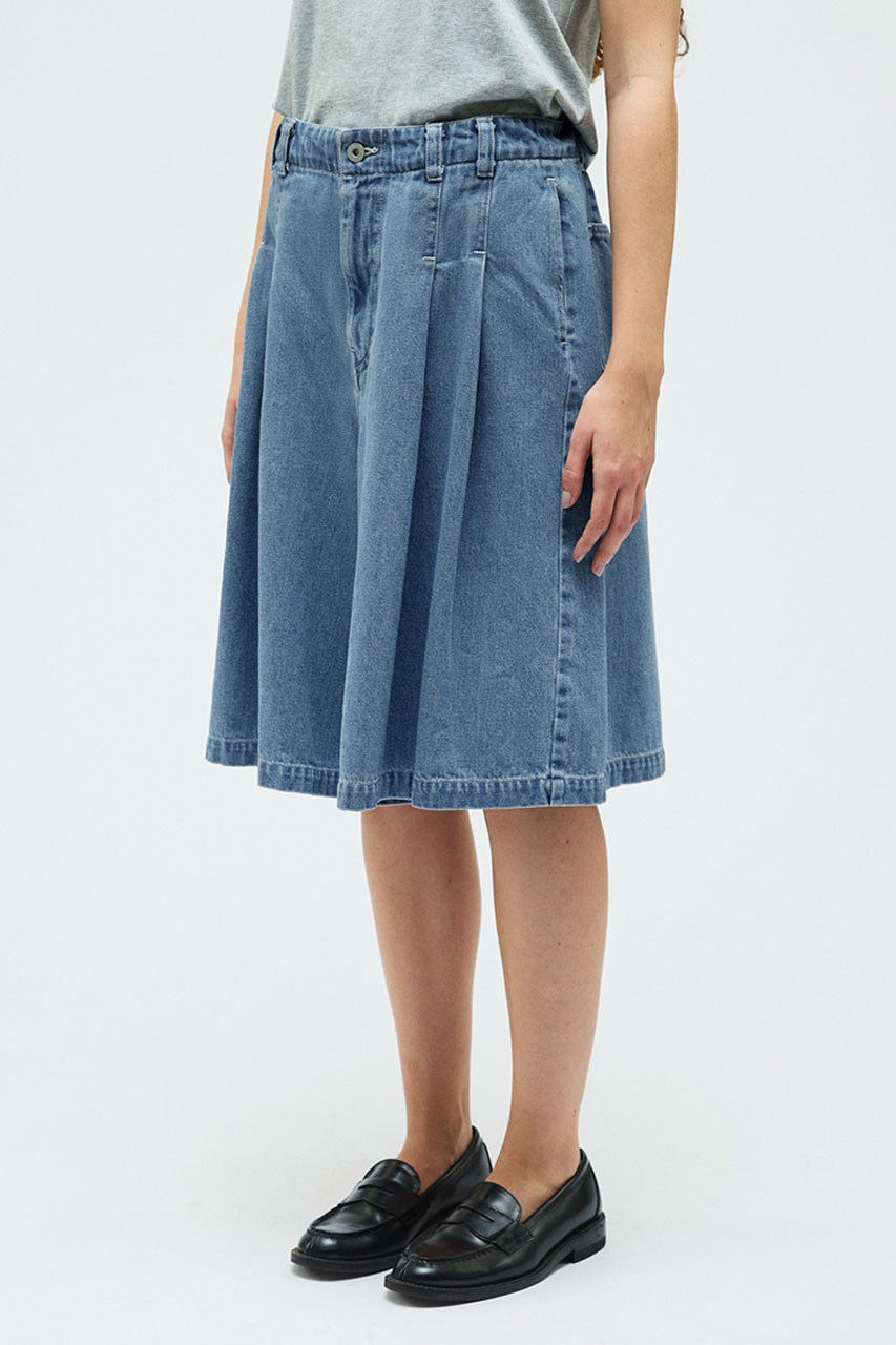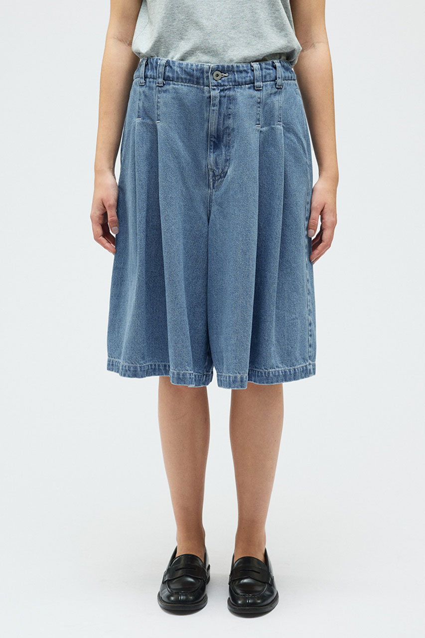 10オンスのデニムを使用した程よい厚みと柔らかさが特徴のハイウエストワイドハーフパンツ(BLEACH)。