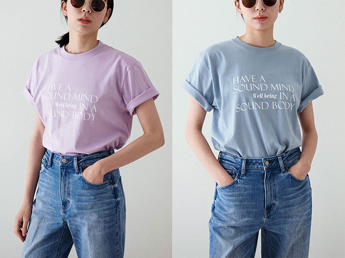 “Have A Sound Mind”のロゴ入りTシャツ。パステルカラーの色合いがデニムあわせにもぴったり。