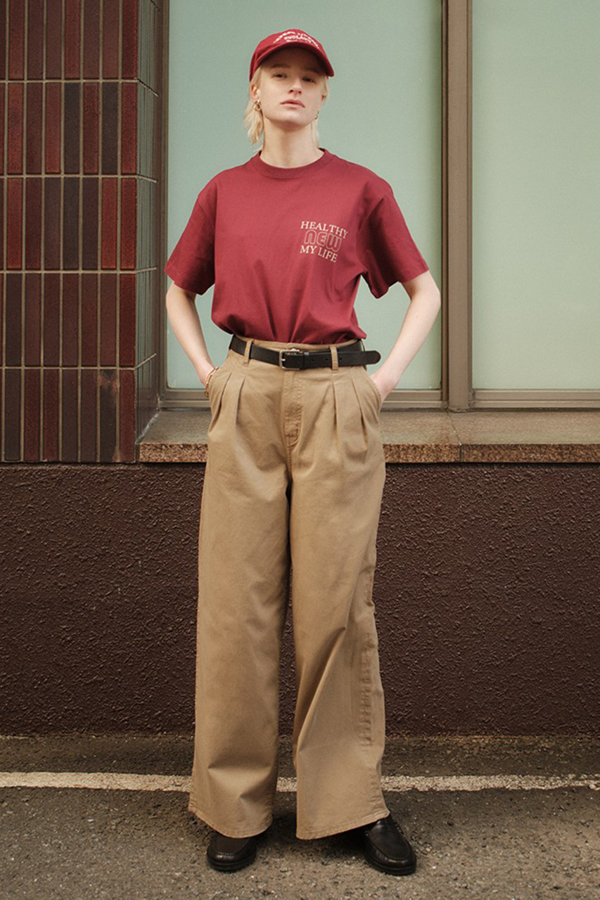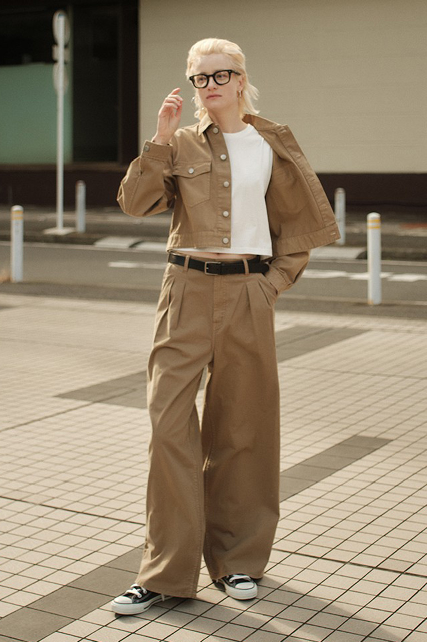 同素材のボトムは、2タックデザインのワイドパンツ“Lemongrass”。デニムとトラウザーの良いとこ取りで、きれいめスタイリングも決まる1本。しっかりと伸縮するストレッチチノを採用し、はき心地の良さと、表地の表面に施したピーチ起毛が特徴。