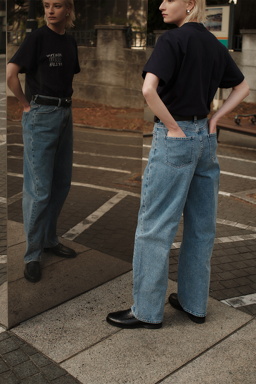 立体的なフォルムを表現するため、通常サイドに真っ直ぐ入っているハギ部分に傾斜を付けたデザインに。コンフォートなストレッチ素材のデニムでありながら経年変化加工を楽しめるベーシックな素材です。