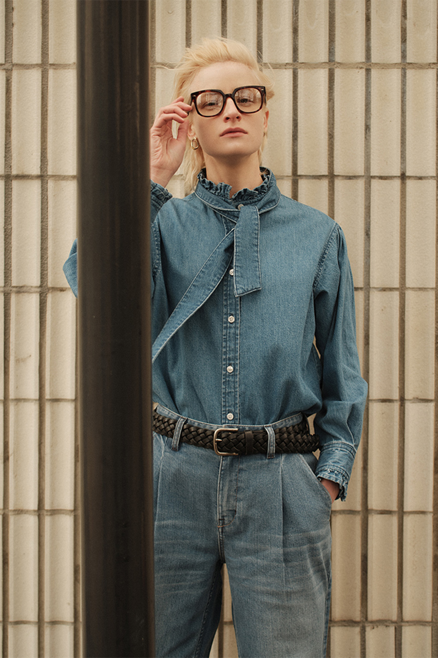 そのままでリラクシーにも、同素材のベルトでウエストマーク風の着こなしも楽しめる2wayデザインのデニムシャツ。柔らかなコットン素材は、着るほどに身体に馴染み、ストレスフリーな着心地を叶えてくれる。フリルネックがお顔まわりへ女性らしさをプラス。レイヤードな着こなしにも重宝します。