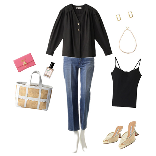 上記と同シリーズのヴィンテージライクなアイテム。胸元のVネック部分はボトムスのバランスに合わせてアレンジができる仕様に。デニムで合わせたOFFスタイルをイメージしたコーディネート。パールのネックレスやヒールがあるサンダルを合わせることで、甘すぎずラフになりすぎない大人に似合うきれいめカジュアルコーデに。