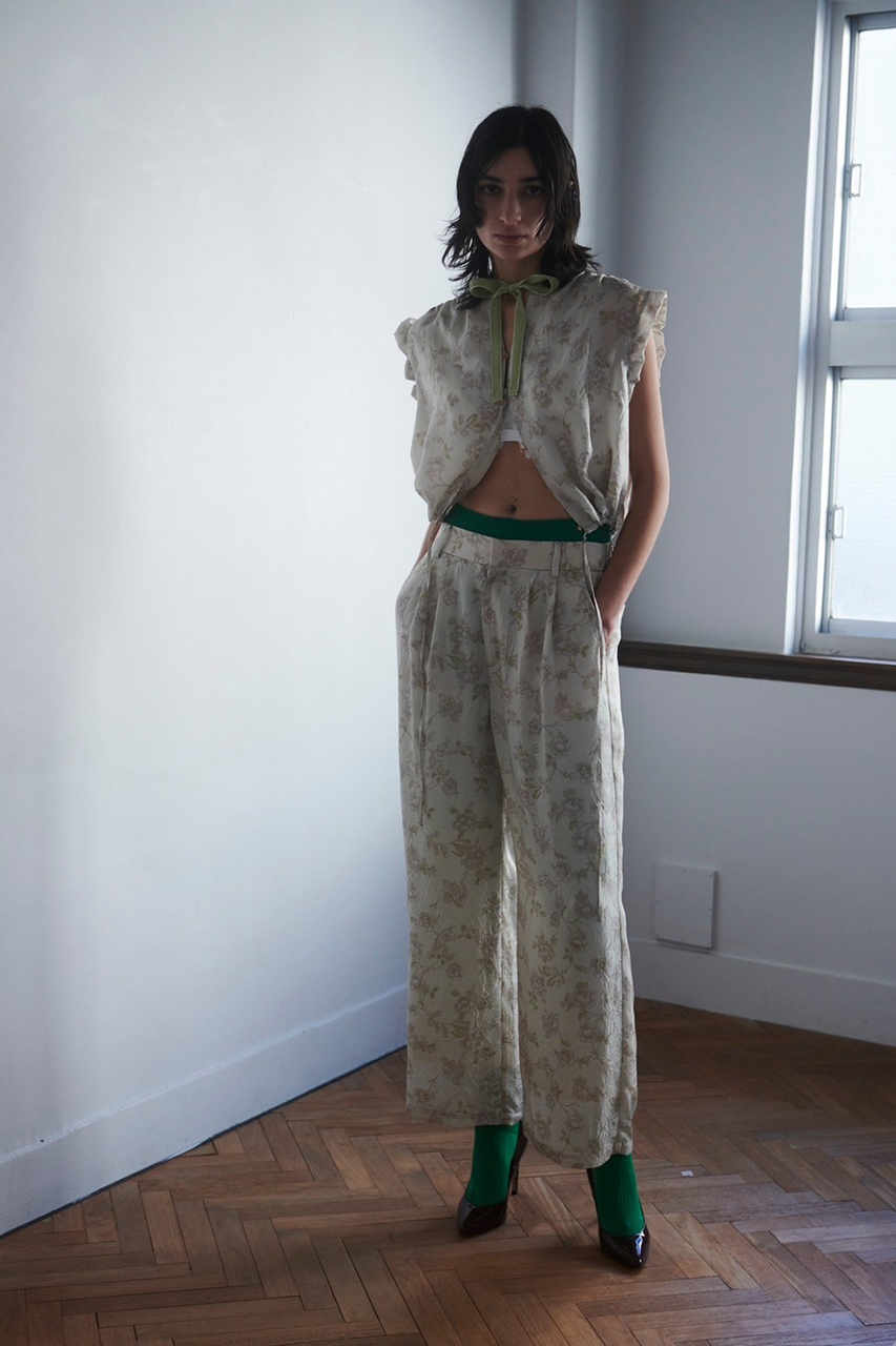 キュプラツイルにシワ加工を施したオリジナルプリントテキスタイル。キュプラならではの滑らかな肌触りと高い吸湿性により、肌にまとわりつかず快適な着心地を実現。ヨーロッパの古い壁紙をモチーフにしたクラシカルな図案と、ベルベットリボンが華やぎを添えます。セットアップで着用していただくのもおすすめです。