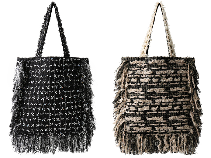 前出のツィードを使用したフリンジバッグ。シンプルなスタイリングもモードに昇華してくれるアイコンバッグとなりそう。