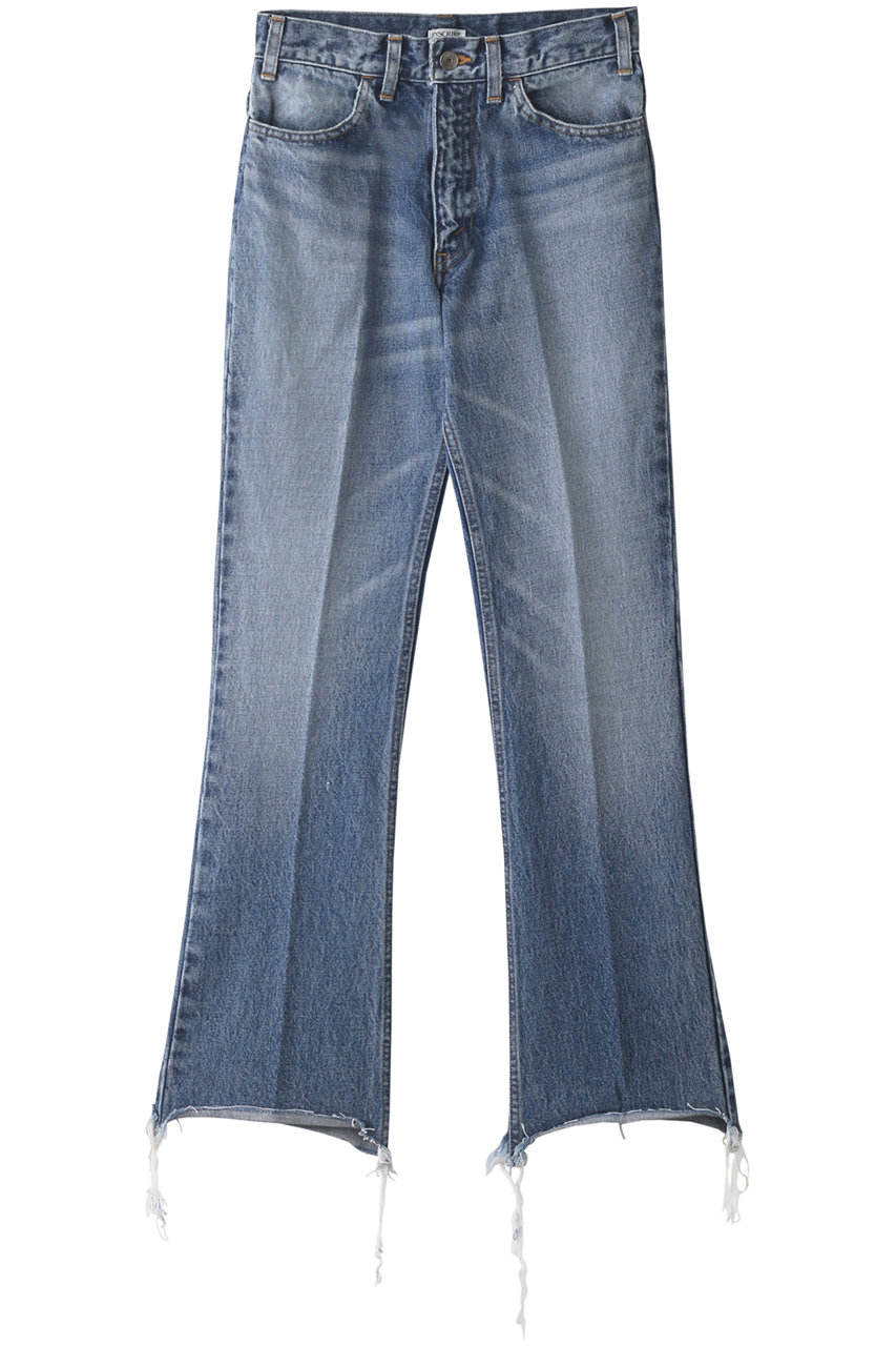ヴィンテージムード漂うスタイルにマッチする、センタープレス入りのフレアデニムパンツ。美しい脚のラインを演出するシルエットに、レディな空気感が漂います。裾の切りっぱなしデザインや、程よいウォッシュ加工がこなれた表情をプラス。