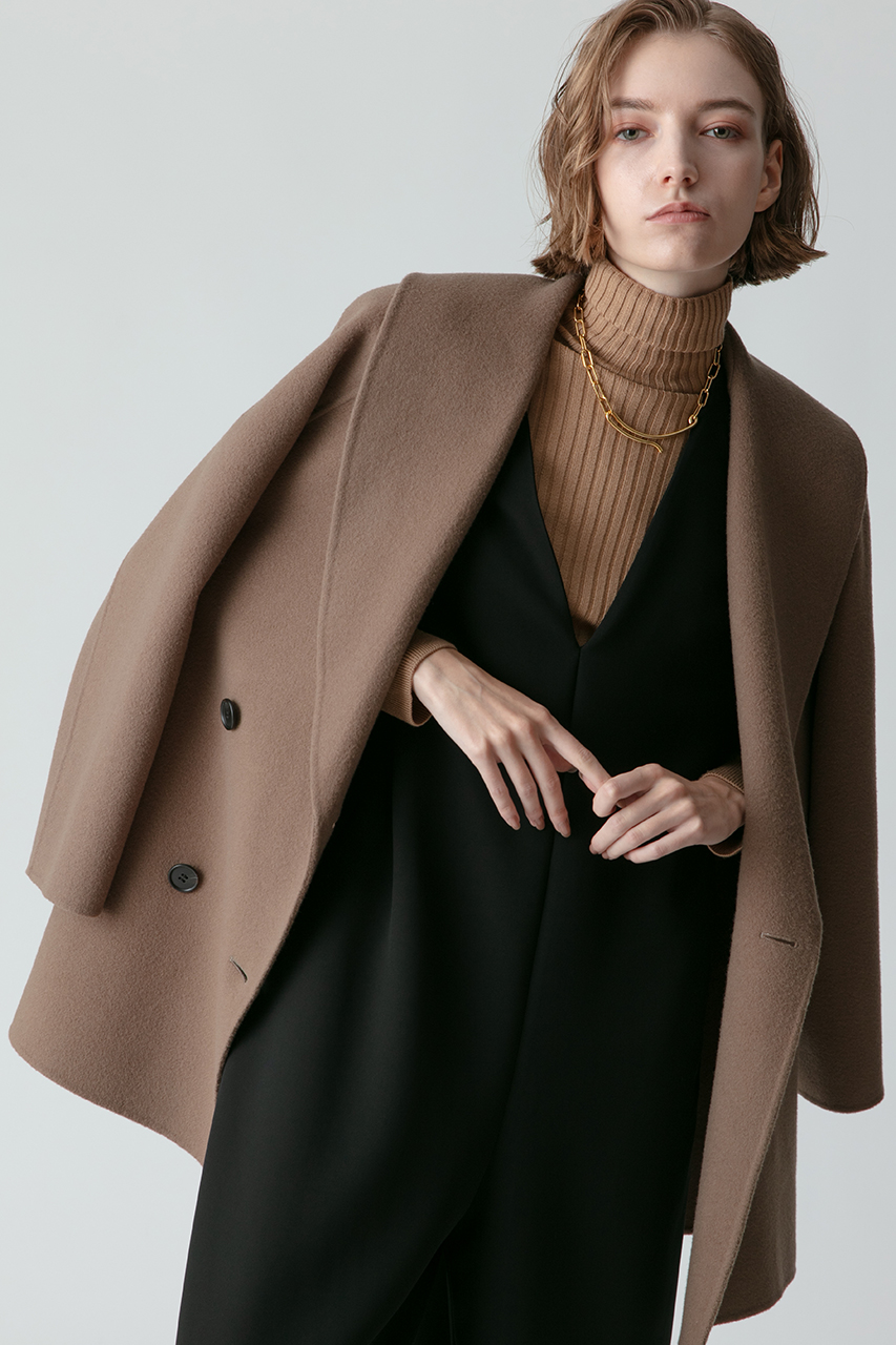 ブラウンのミドル丈コートやベージュのニットでマイルドな印象に。
