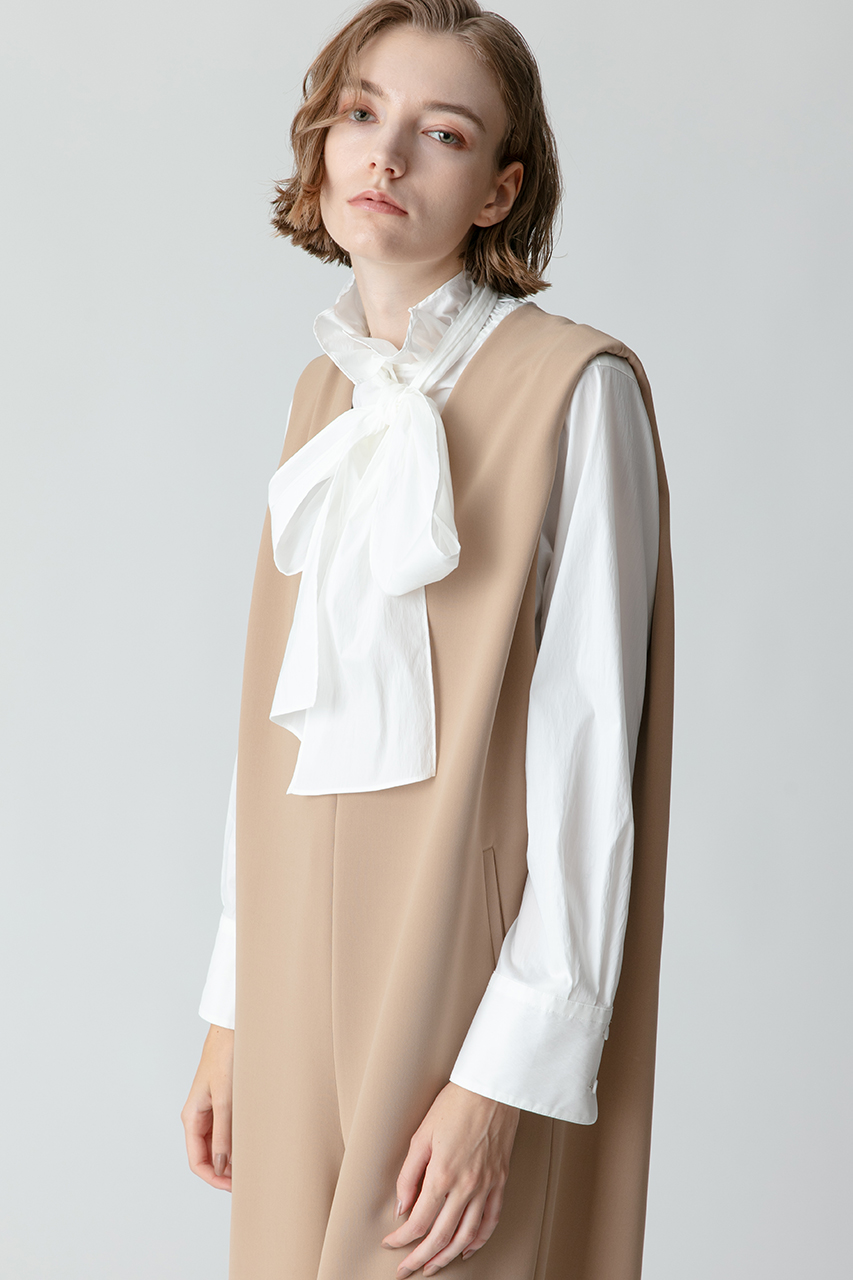 胸元の深いVラインでレイヤードスタイルもスッキリと仕上げます。