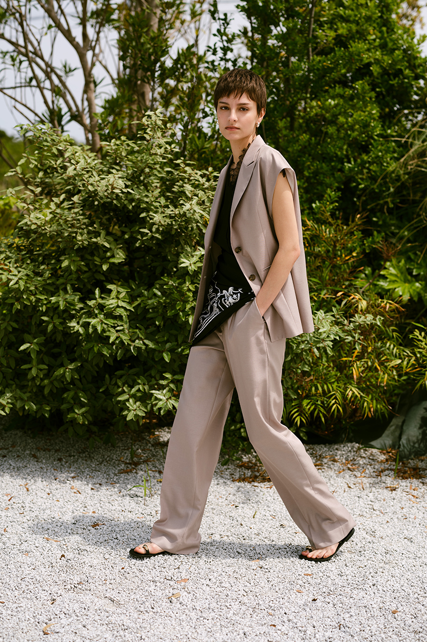 接触冷感、防シワ、イージーケアの機能性素材を使用したテーラードジレとタックパンツは単品での着回し力の高いアイテム。
