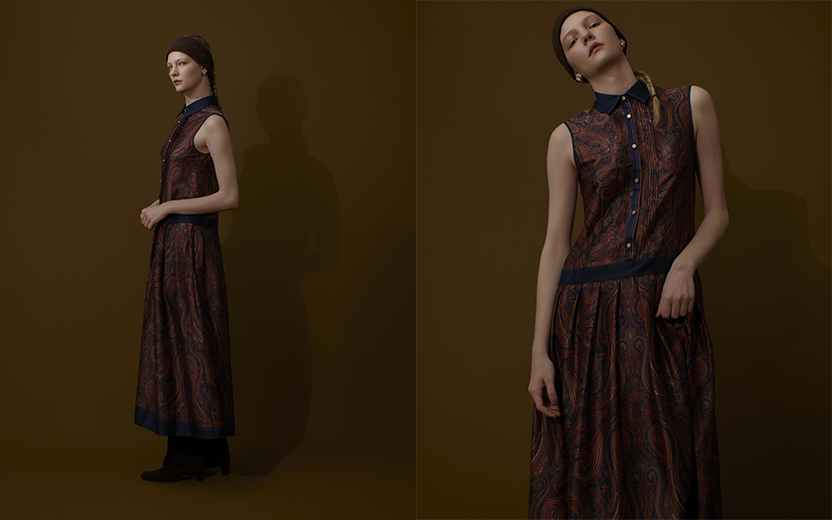 エスニックな印象のあるペイズリーパターンをネイビーラインでモードな印象に引き締めたパネルモチーフの素材を使用したワンピース。
