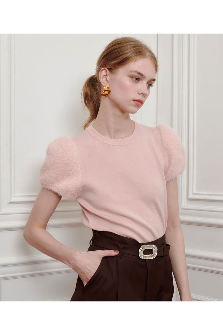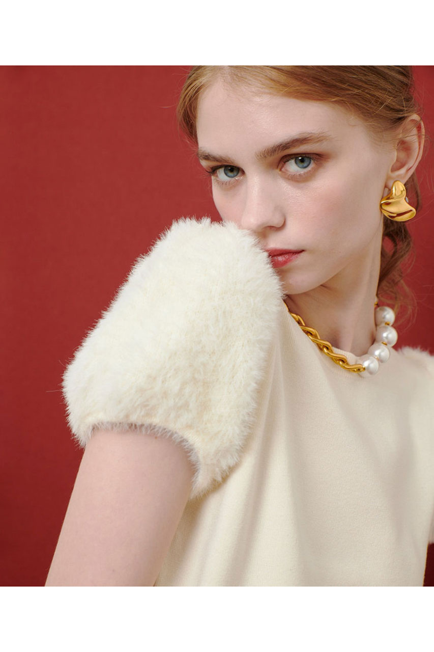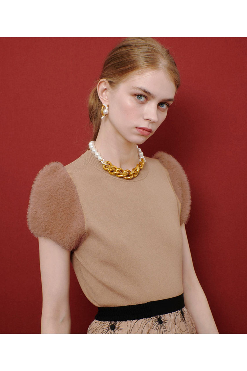 身頃はスッキリとしたニット、裾はフェイクファーでボリュームがあるAラインシルエットのトップス。