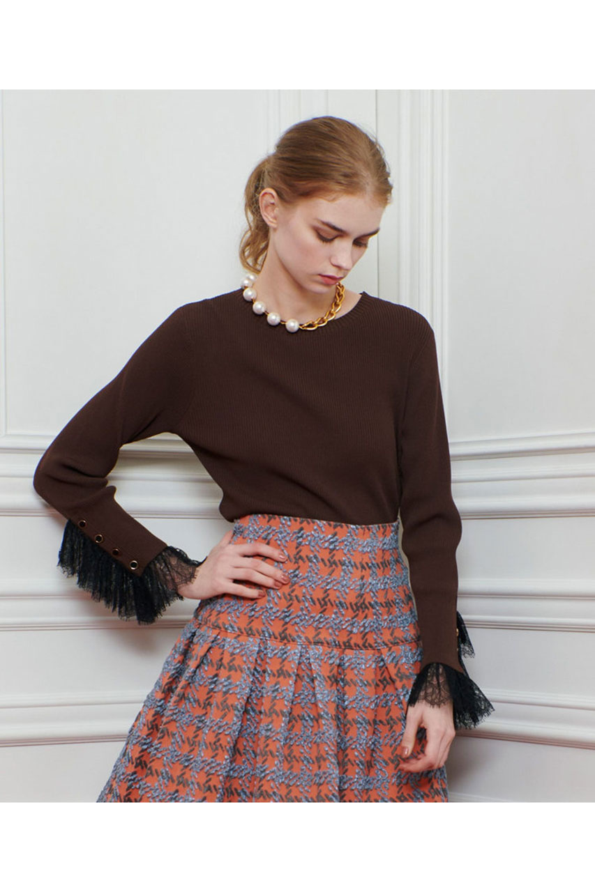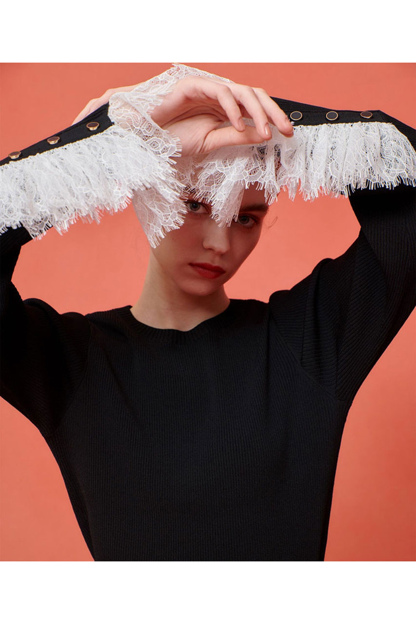 秋が深まったらアウターなどに重ねて見える袖口のレースをアクセントとして楽しんでいただけます。