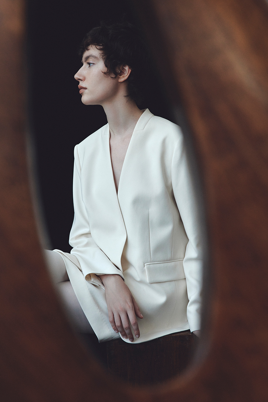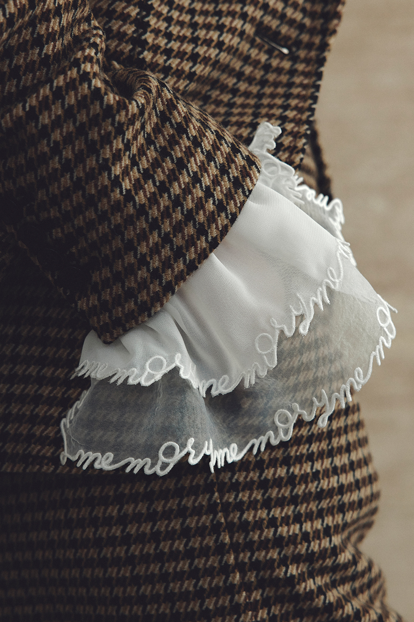 インナーに着たブラウスは襟元と袖口のmemoryの刺繍が遊び心あふれるカンバセーションピース。