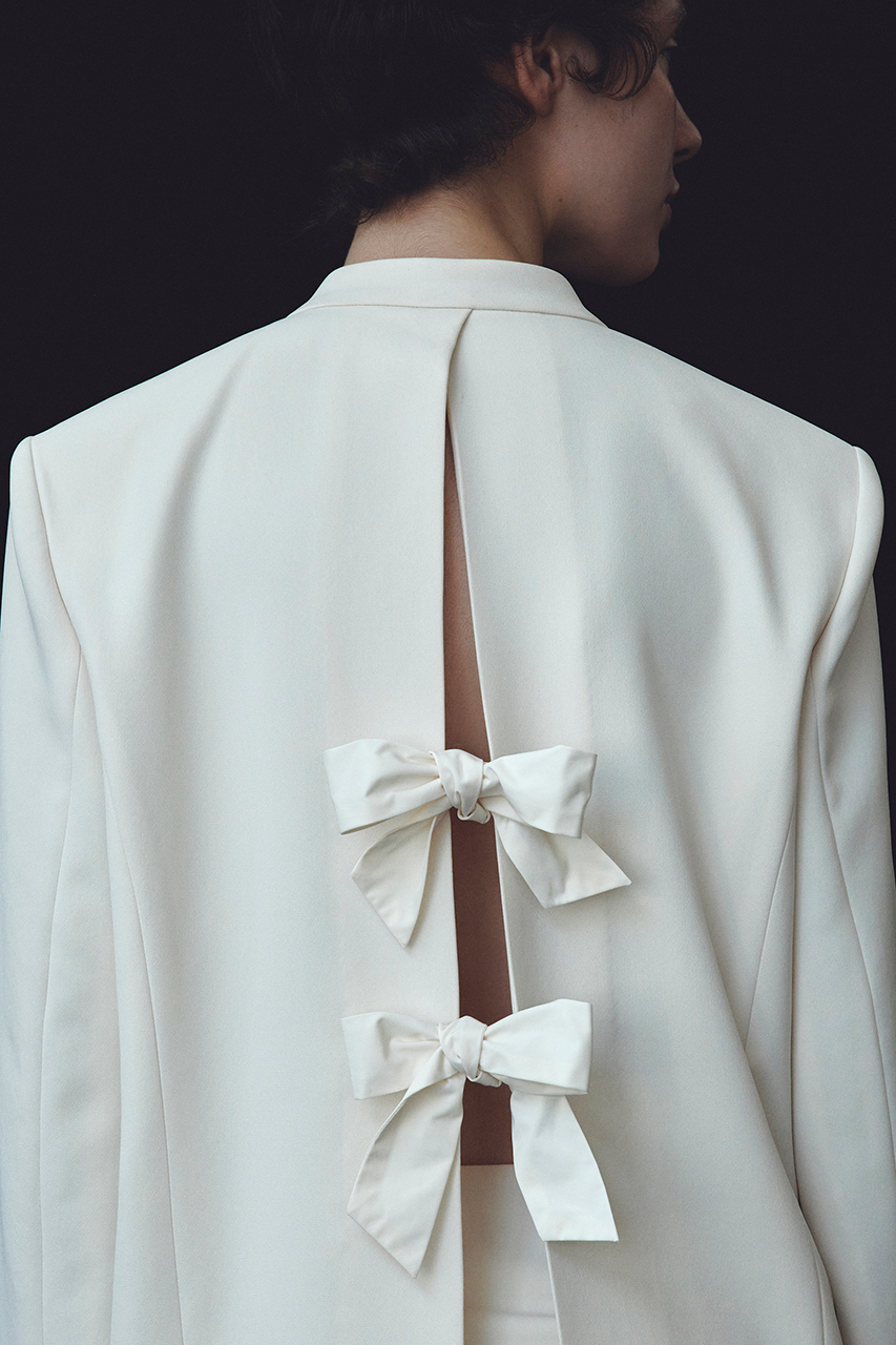 背面にはリボンがのぞく深いスリット入りでモードな印象に。