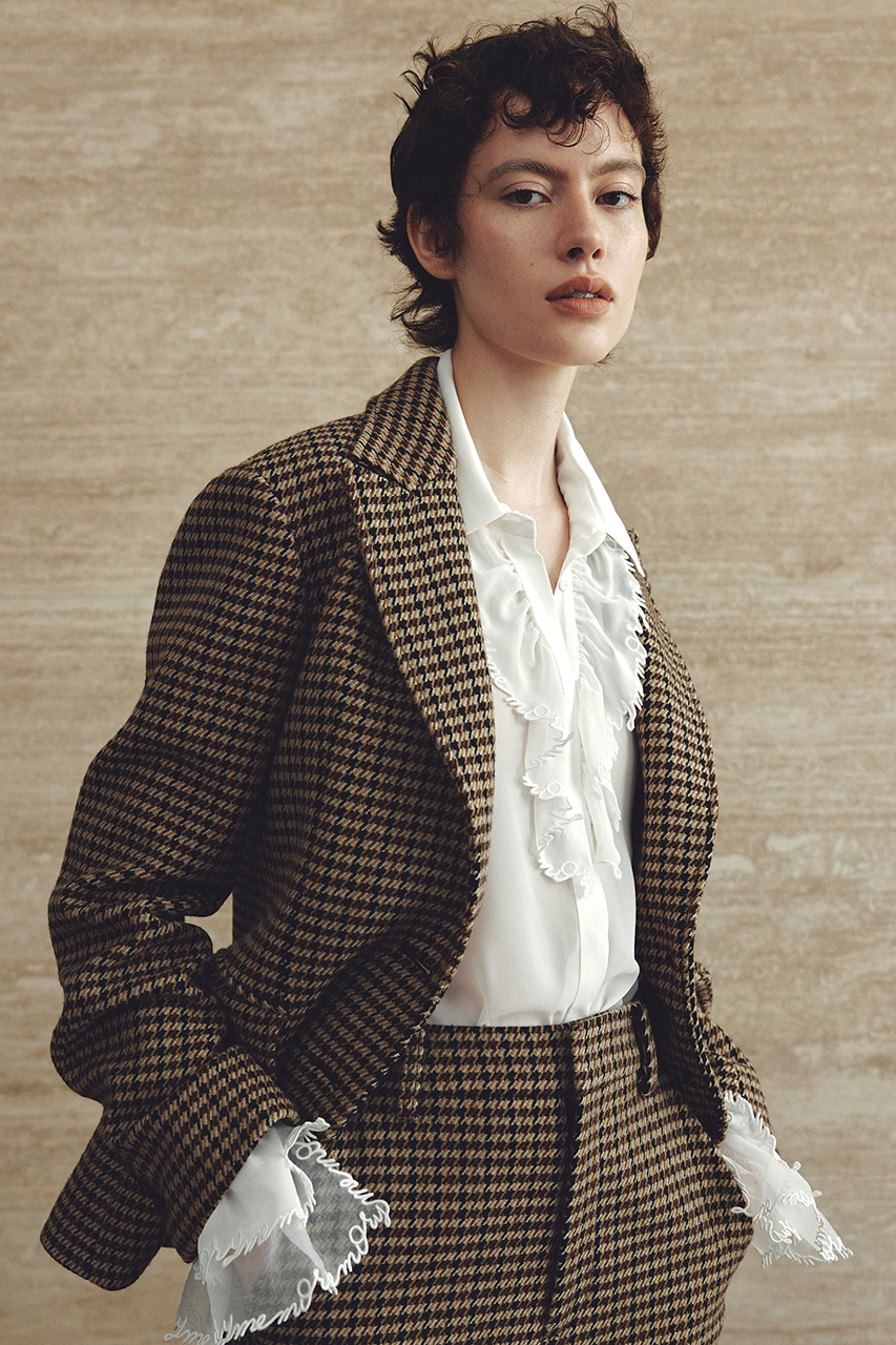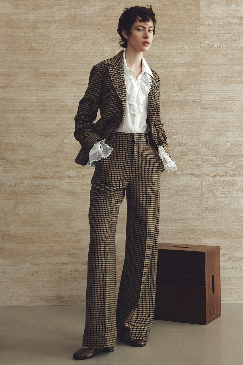 マニッシュなガンクラブチェック素材を使用したジャケットとパンツ。