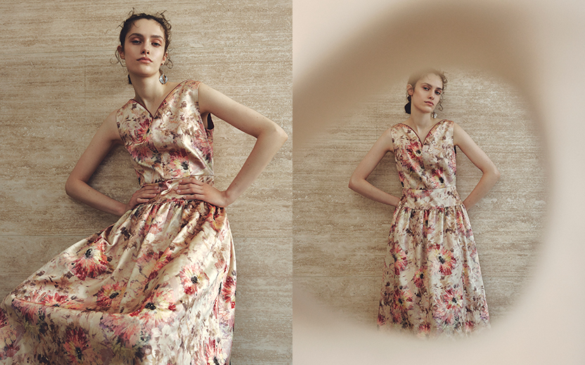 重厚感のあるサテン生地に水彩タッチのフラワー柄をプリントし、複雑に重なったカラーの奥行きが魅力の一枚。