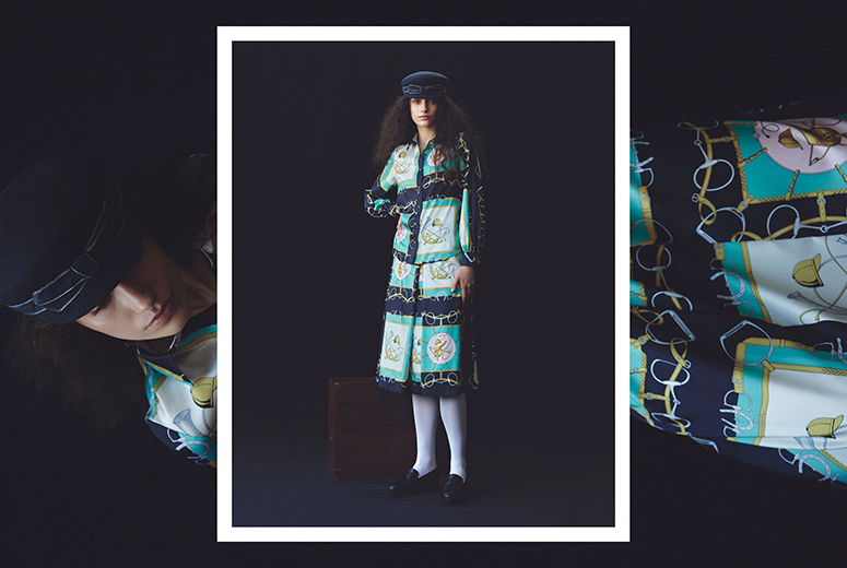 スカーフを洋服に仕立てたような柄行きのブラウスとスカート。