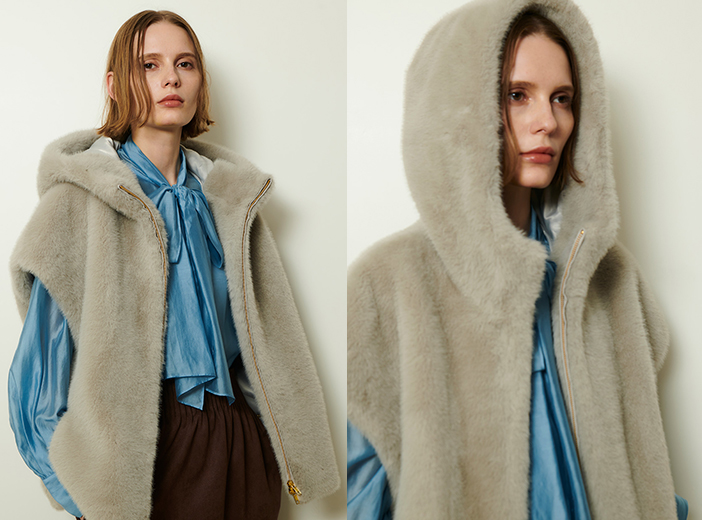 カジュアルなフード型とフェイクミンク素材が程よいバランスのブルゾン。