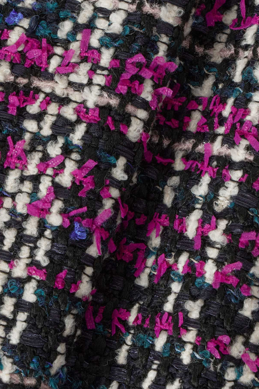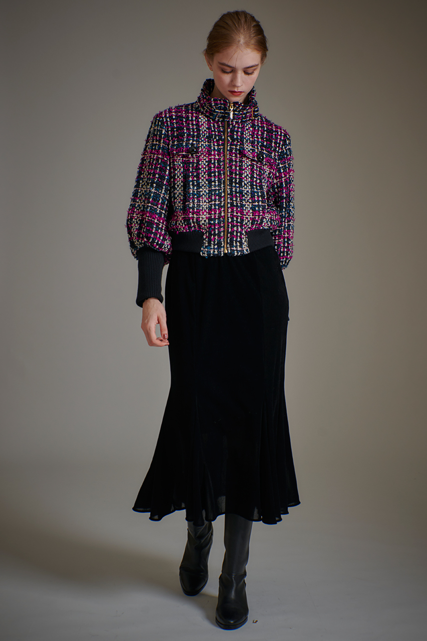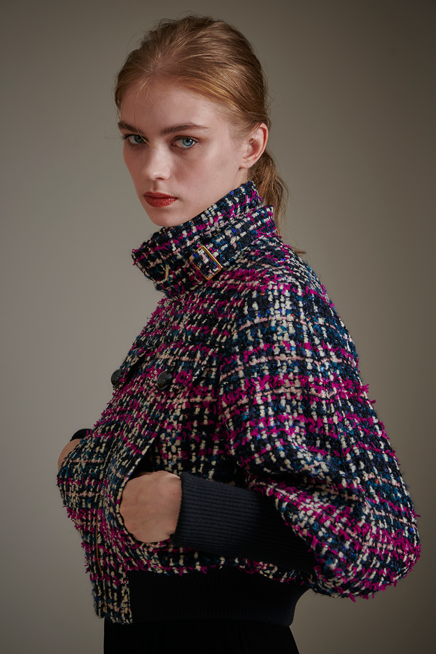 パープル、ホワイト、ブラックの糸で織られたフランスのエッセンス薫る素材でトレンドのショートブルゾンに。