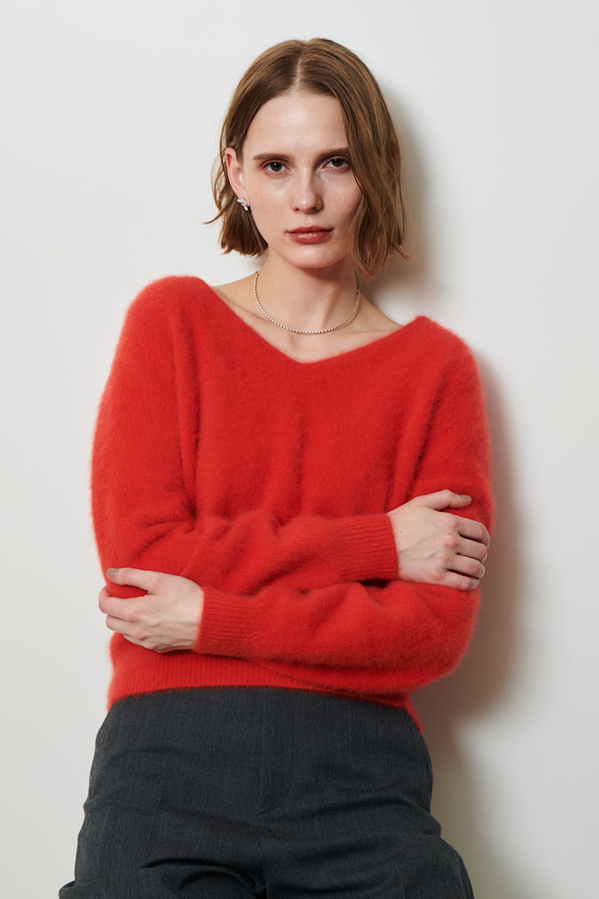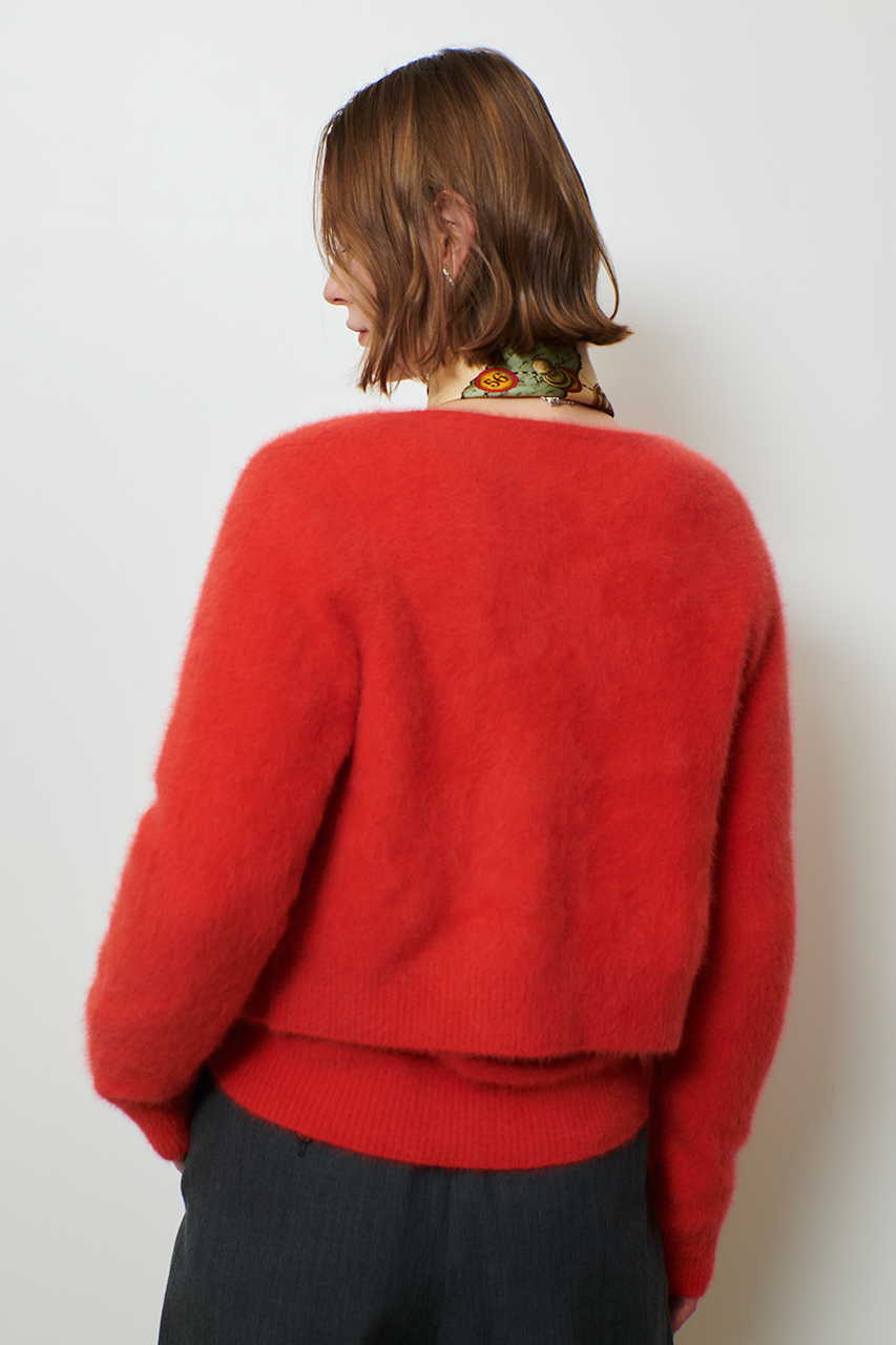 纏うだけで気分高まるふわもこニット。あたたかみのあるオレンジは冬の装いに華やぎをプラス。同素材のカーディガンでアンサンブルも。