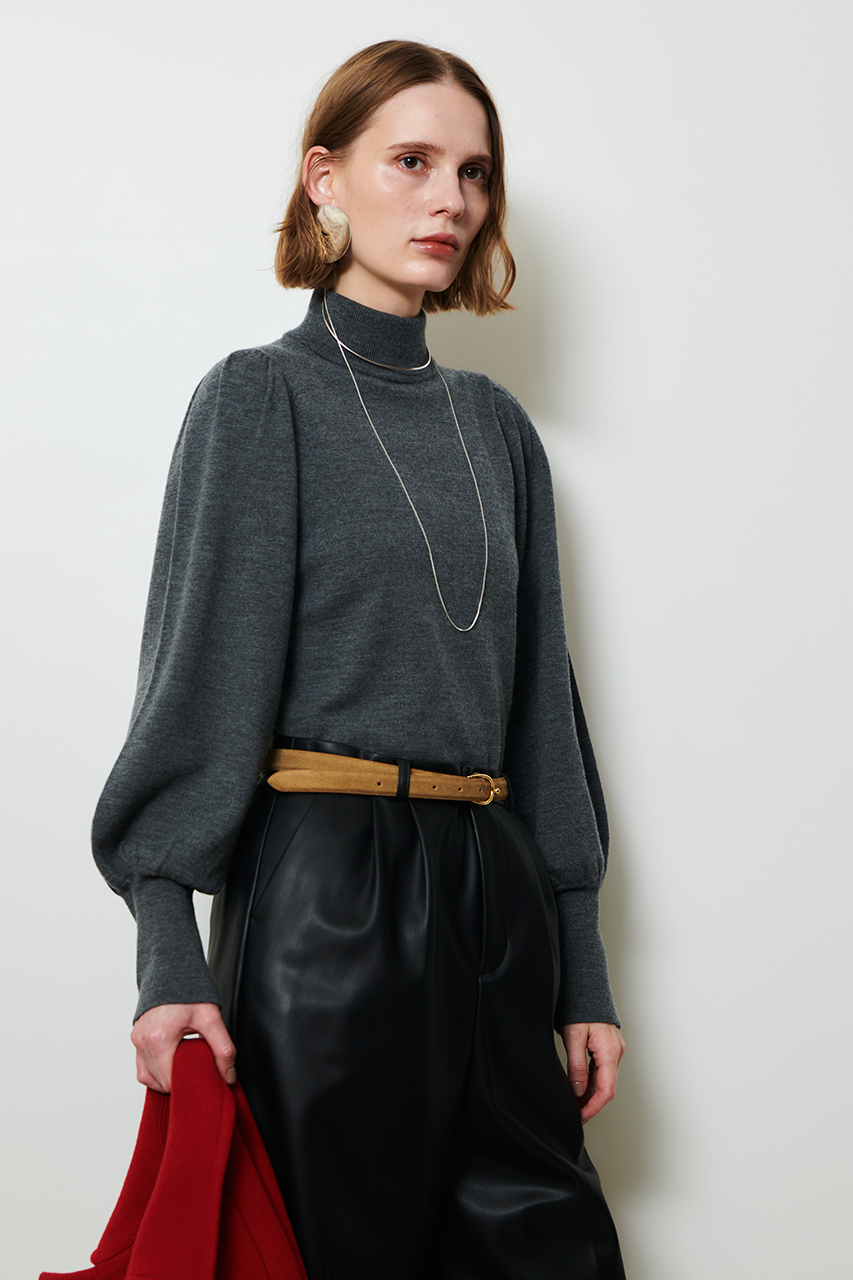 長めのリブとパフスリーブのバランスが美しいシルエットを生み出し、1枚でサマになるデザインに。Pコートやテーラーディティールの首元の開いたアウターとの相性も◎