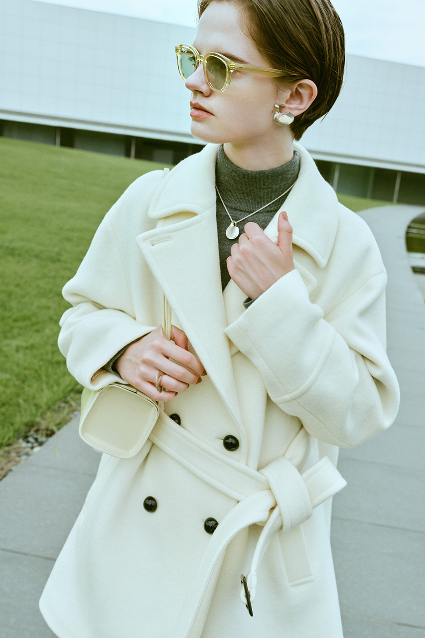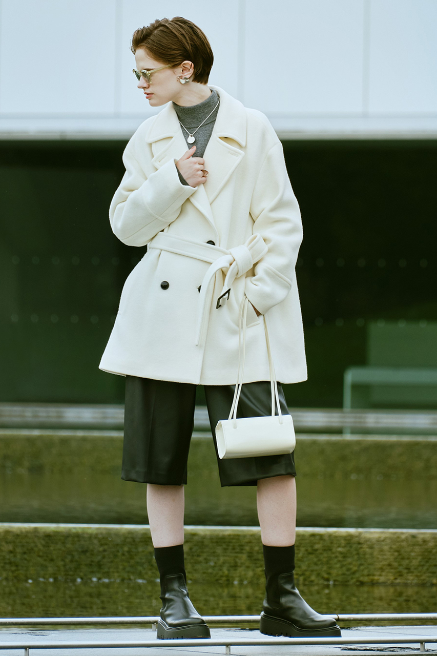 マルチウェイなPコート。チンベルトでスタンドカラーにすればマニッシュな雰囲気に。ヒップが隠れる絶妙なバランスの丈感でボトムス合わせが楽しくなる1着。