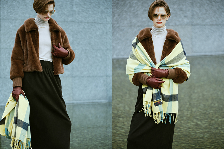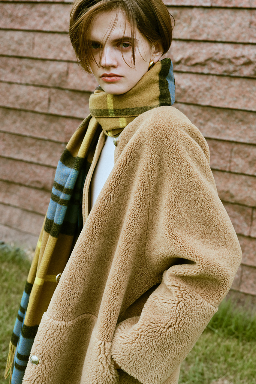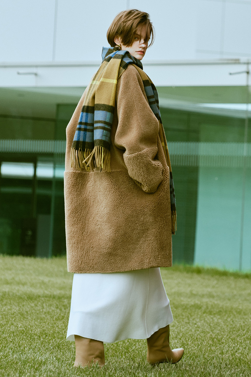 トレンドアウターはフェイクムートン×ボアのブロッキングで差をつけて。着脹れを抑えたコクーンシルエットも魅力。