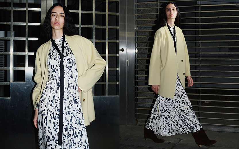 今季注目のミディアム丈のアウターはニュアンスカラーで差をつけて。ウールカシミヤの質感と艶のあるアイテムを合わせてリュクスな印象に。