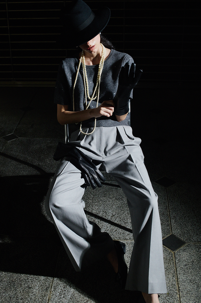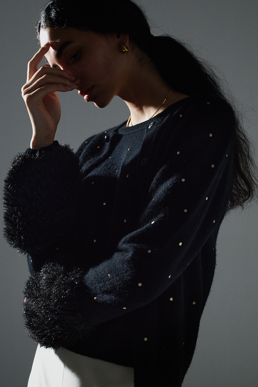小ぶりなメタリックヤーンのドットがポイントのニットアンサンブル。美しいラインのセンタープレスパンツでモードなスタイルが完成。