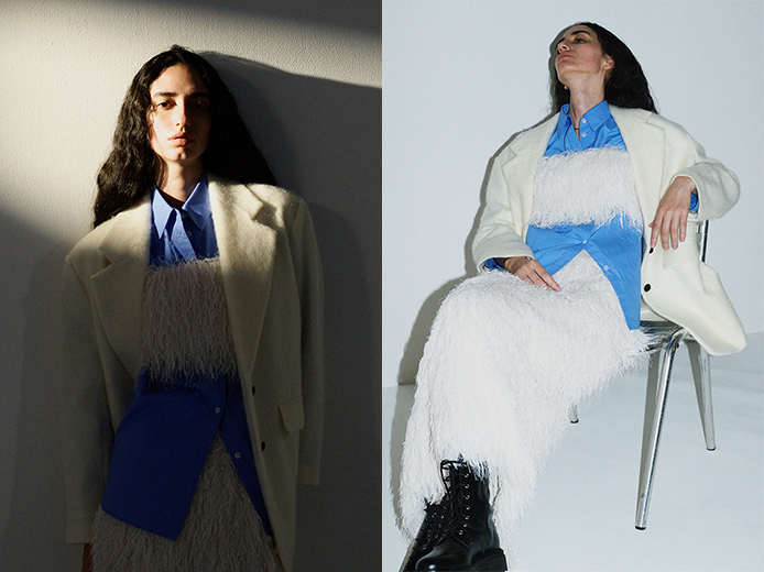 毛足の長いフェザーにラメを散りばめて華やぎをプラスしたアイテム。セットアップでもそれぞれ単品でもサマになる存在感のあるシリーズです。