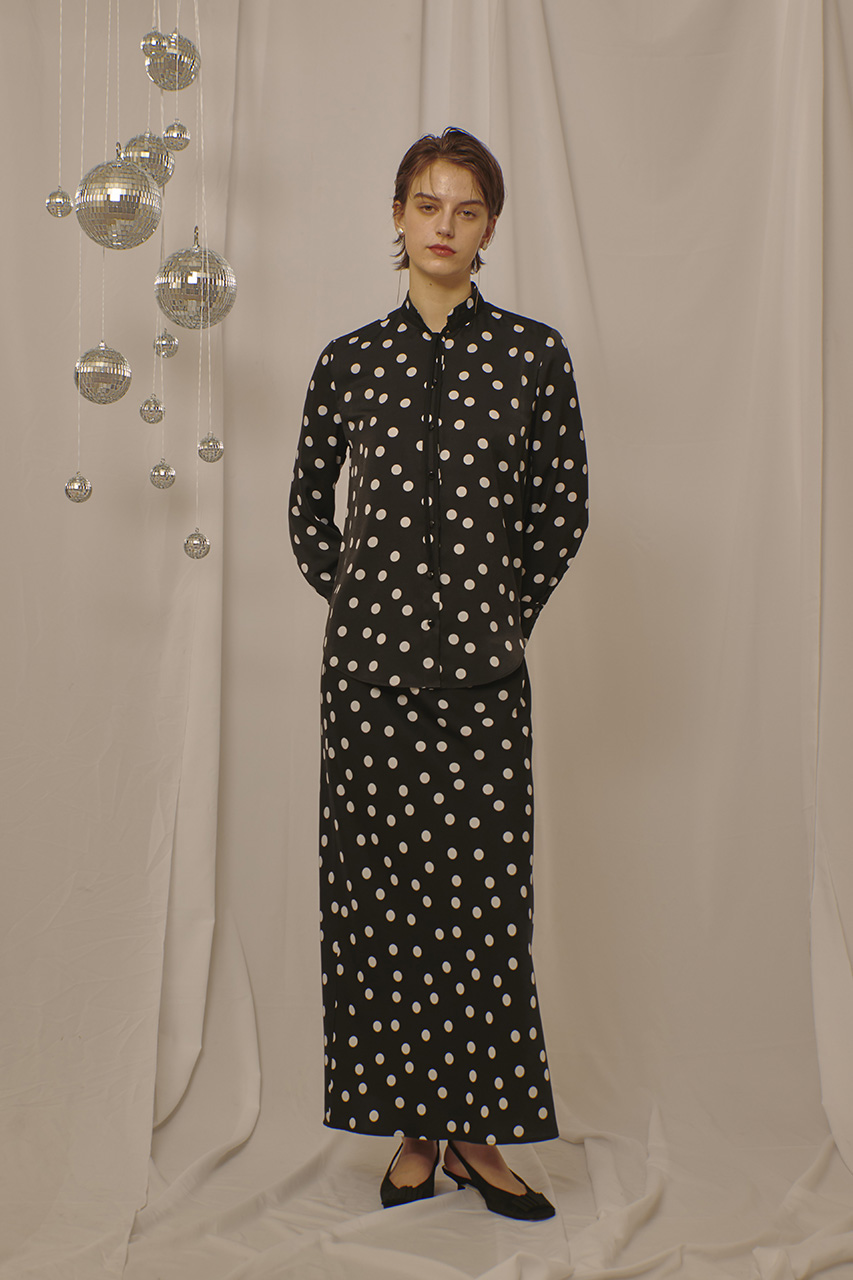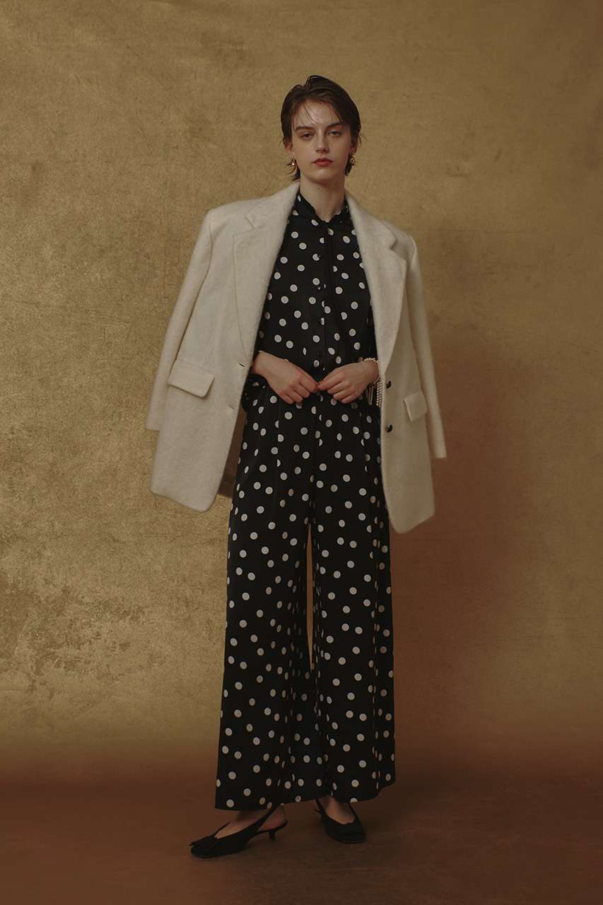 光沢と落ち感のある滑らかな風合いがカジュアルになり過ぎず、レディな印象に仕上げてくれるセットアップ。タイやウエストラインの配色がさりげないアクセントに。それぞれ単品でも着回しの効くシリーズです。