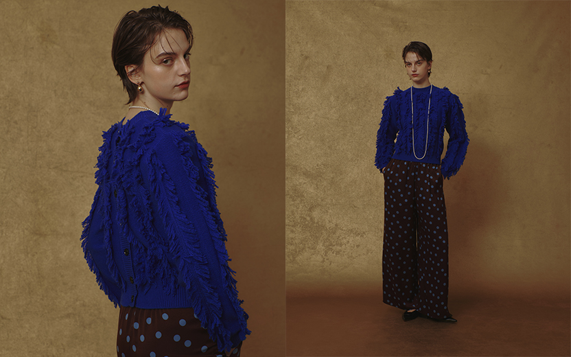 存在感のあるフリンジディティールでニットコーデに差をつけて。コンパクトなフォルムはボトムスを選ばず、カーディガンとして着用する時はワンピースとの相性も◎